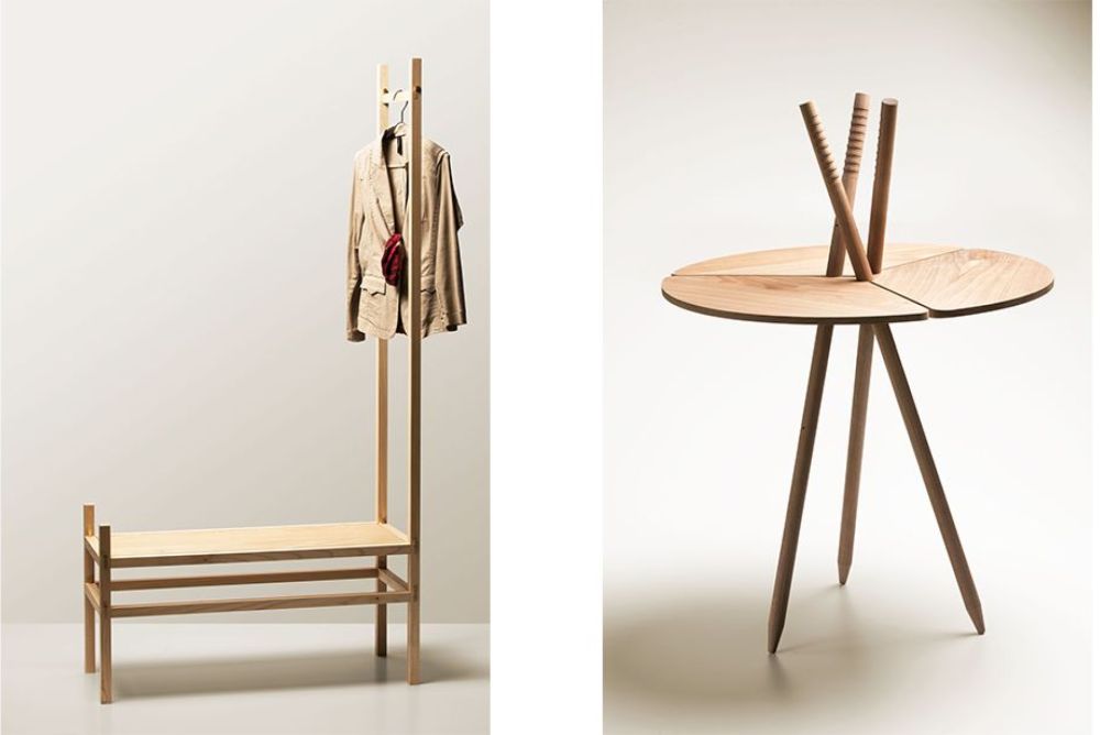Die Garderobe «Colliaziun» (links) und der Bistrotisch «Traifegl» gewinnen den Wettbewerb gemeinsam. Bilder: Verein Mobiglias