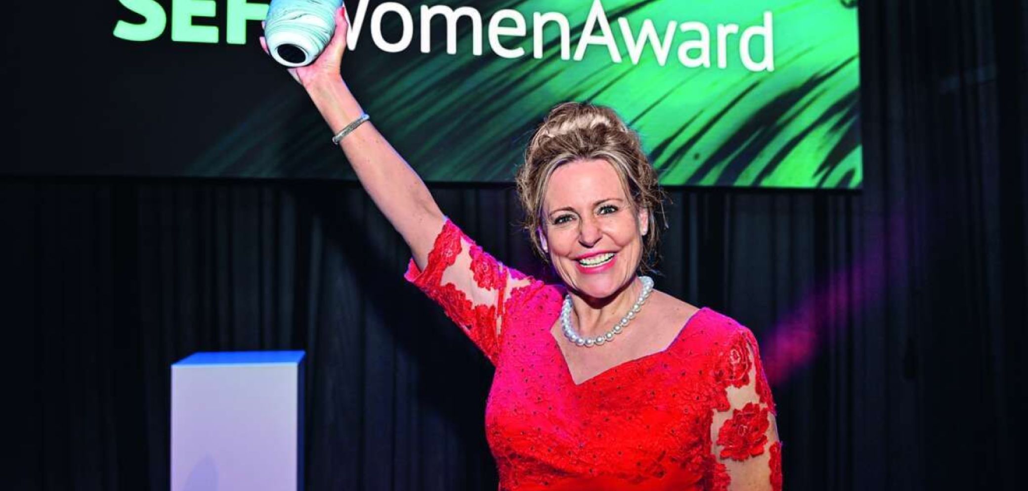 Schreinerei-Unternehmerin Brigitte Breisacher hat eine weitere Trophäe in die Höhe gestemmt. Bild: NZZ Connect