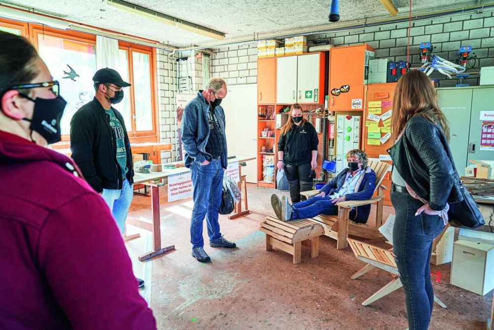 In der Schreinerei Kirchmann in Walkringen BE testen Besucher eine Liege. Bild: Schreinerei Kirchmann
