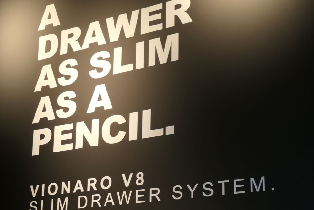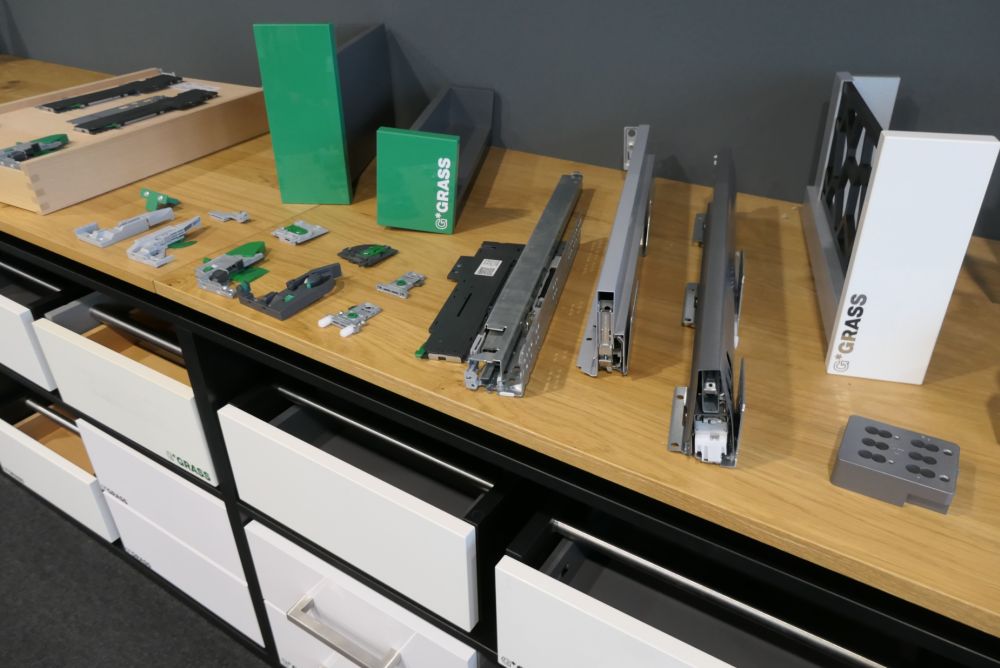 Der Neubau verkörpert mit hochautomatisiertem Logistiksystem, mit zu Schulungszwecken eingerichteter Grass-Akademie und mit überraschenden Effekten ausgestattetem Experiencecenter «den neuen Spirit» des Unternehmens, wie es CEO Albert Trebo ausdrückt. «Wir wollen den Pioniergeist des Unternehmens wiederentdecken. Ein agiles Unternehmen aufstellen, das auf gesellschaftlichen und wirtschaftlichen Wandel einerseits flexibel reagieren, andererseits kreativ agieren und Impulse setzen kann.» Als Beispiel dafür ist im Showroom die Schublade «Vionaro V8» ausgestellt – entwickelt aus der spontanen Eingebung, eine Stahlzarge zu entwickeln, so schmal wie ein Bleistift. Die Vollmetall-Schublade ist recycelbar und steht so laut dem Markenverantwortlichen Harald Klüh für eine weitere Maxime des Unternehmens: «Wir wollen eine grüne Zukunft aufbauen – dies im wahrsten Sinne des Wortes.»