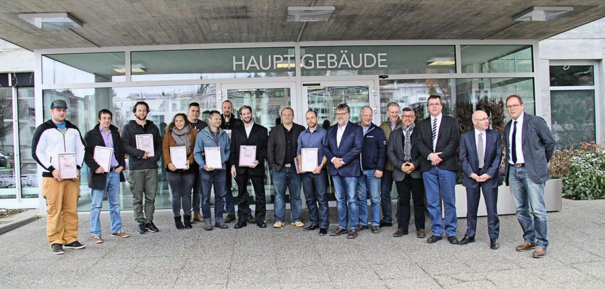 Bernhard Beutler fand lobende Worte für die erbrachten Leistungen der Diplomanden. Es sei nicht immer einfach, den Weg der berufsbegleitenden Weiterbildung zu gehen und das Ziel auch wirklich zu erreichen. Der erfolgreiche Abschluss bürge für die Disziplin, den Einsatzwillen sowie das Bestreben, etwas mehr zu tun, als es der Normalfall verlangt. Er schätzt die angenehme Zusammenarbeit mit der Firma Teknos Feyco. Das Nutzen von Synergien beider Institutionen ergebe einen hohen Stellenwert für Qualität in dieser Bildungs- richtung, könne doch das Wissen aus Theorie und Praxis optimal genutzt und eingesetzt werden. Davon profitieren vor allem die Teilnehmer an den Lehrgängen für Oberflächenbehandlung.