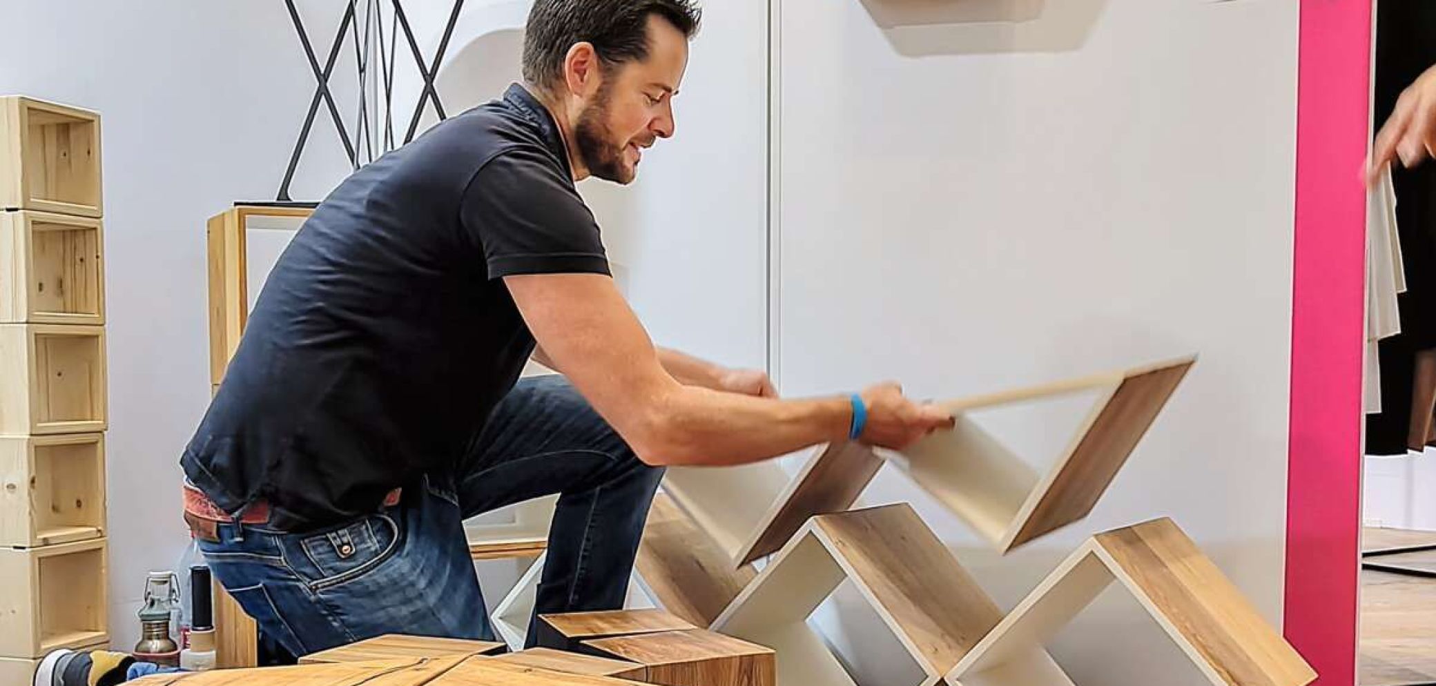 «Bei mir ist alles in Bewegung», sagt Schreiner Patrick Kurmann. Seinen gelernten Beruf hat er zum Hobby gemacht und fertigt in seiner kleinen Werkstatt in Greppen LU unter dem Label «deindreh» Möbel, die sich von rund zu eckig, von hoch zu flach oder vom liegenden Sechskant zu einem stehenden Rechteck wandeln lassen. Möglich machen das Textilbänder, die zwei Korpusse an ihrer Gehrungskante aussen miteinander verbinden. So lassen sich die beiden Teile in zwei Richtungen klappen. Wie geschaffen scheinen seine Kleinmöbel für die Blickfang. Denn irgendwas ist immer in Bewegung, die Leute bleiben stehen, schauen, staunen, und im besten Fall greifen sie zu und kaufen ihr Lieblingsstück direkt.