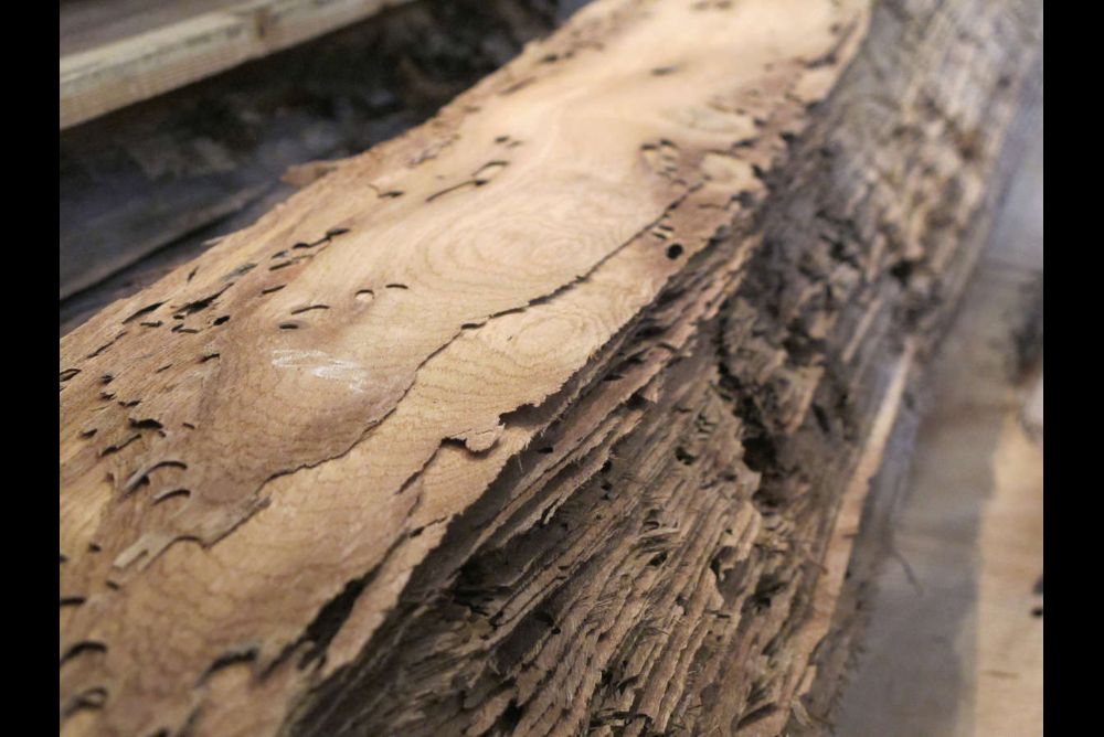 www.siso.dk«Briccola di Venezia» heisst das Furnier des italienischen Händlers Edillegno Tranciati. Es wird gemessert aus den Eichenpfählen aus Venedig. Durch den Wasserkontakt ergibt sich eine rustikale und oft unregelmässige Farbgebung. Eine Herausforderung für das Legen eines Bildes sind allerdings die zahlreichen Bohrlöcher von Holzschädlingen. Bei den Mustertafeln wurden diese mit einem Harz ausgegossen.