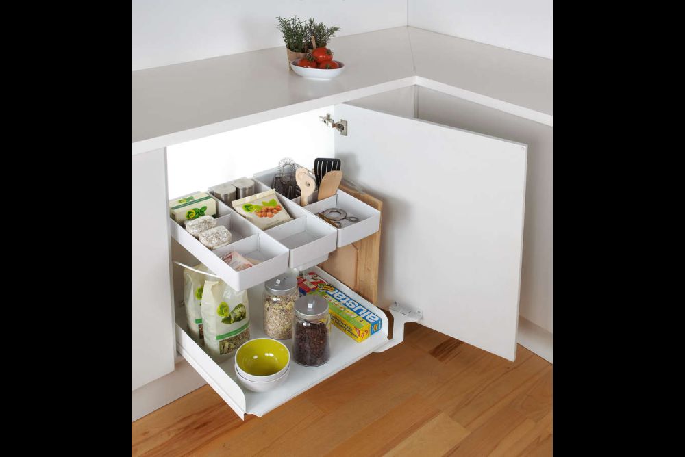 www.opo.chwww.bbag.chAuf der Basis des Typs Libell aus Metall hat die Peka-System AG eine neue Gliederung für Unterschränke präsentiert. Beim Öffnen der Drehtür fahren sowohl das untere Tablar als auch die darüber angebrachte Ordnungseinheit gleichzeitig vor. Der «Kitchen Tower» ist für 450 und 600 mm breite Korpusmöbel erhältlich und kann links und rechts montiert werden. Der Vollauszug wird am Korpusboden montiert und ist mit einem Selbsteinzug und natürlich auch einem Dämpfer ausgestattet. Die Kunststoffbehälter sind aus UV-beständigem, lebenmittelechtem und spülmaschinenfestem ABS-Kunststoff. Lieferbar ist der «Kitchen-Tower» ab Februar 2015.