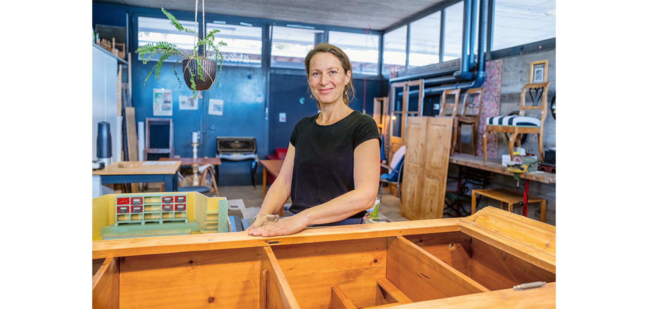 «Noch heute kommen ab und zu Leute herein und fragen nach Billetten», erzählt die 45-jährige Schreinerin. Da könne ein Stuhl im Weg stehen mit Schraubzwingen daran, das hindere die Passanten nicht daran, an den ehemaligen Schalter zu kommen. «Oder sie verwechseln die Antikschreinerei mit einem Café, weil ich oft meinen Pausenkaffee in der früheren Wartehalle trinke, die jetzt als kleiner Laden dient.» Die Werkstatt ist hell und hat auf zwei Seiten grosse Fensterfronten. Tritt man ein, steht man in der ehemaligen Schalterhalle; da liegt ein Tannenschrank, den Lisa Lutz restauriert. Geht man durch eine weitere Tür, steht man in der Werkstatt. Lisa Lutz zeigt auf einen nostalgischen Chrämerliladen aus Holz: «Den hat mir eine Kundin geschenkt. Sie hat als Kind damit gespielt, so wie ihre Tochter und ihr Enkelkind. Ich werde ihn restaurieren und dann in meinem Laden verkaufen. So trage ich dazu bei, dass Dinge erhalten und weiter genutzt werden können.» Die grosse Werkstatt hat noch einen dritten Raum, da, wo früher die Bahnangestellten hinter den Scheiben die Billette herausgegeben haben. Darin sind Möbel zum Verkauf: Stühle, Kinderschaukel, Kinderbettchen. Jedes Unikat trägt eine Geschichte. Lutz möchte die Möbel erhalten und damit auch deren Geschichte. «Es ist eine Alternative zu Konsum und Abfallbergen. Ich arbeite mit Kopf, Herz und Hand. Das spürt meine Kundschaft und macht mich zufrieden.»