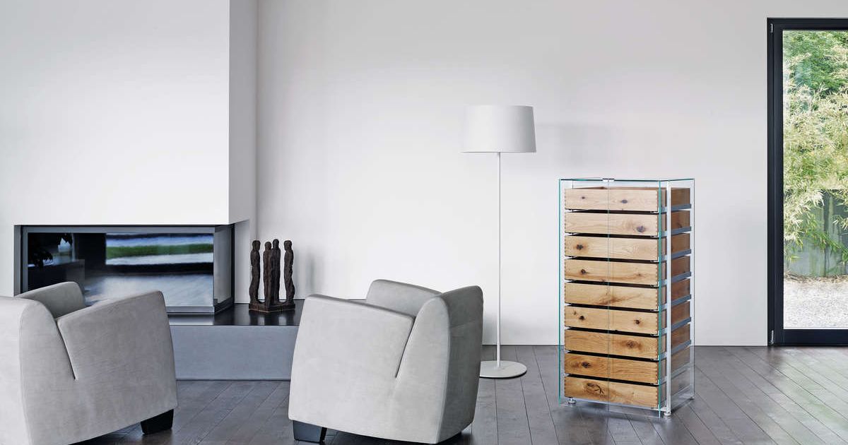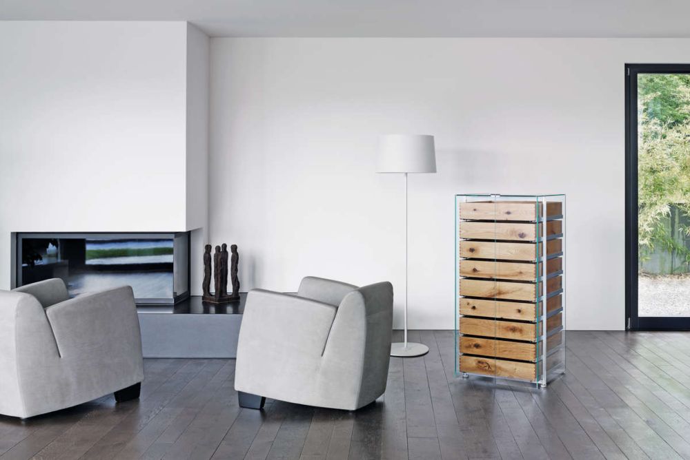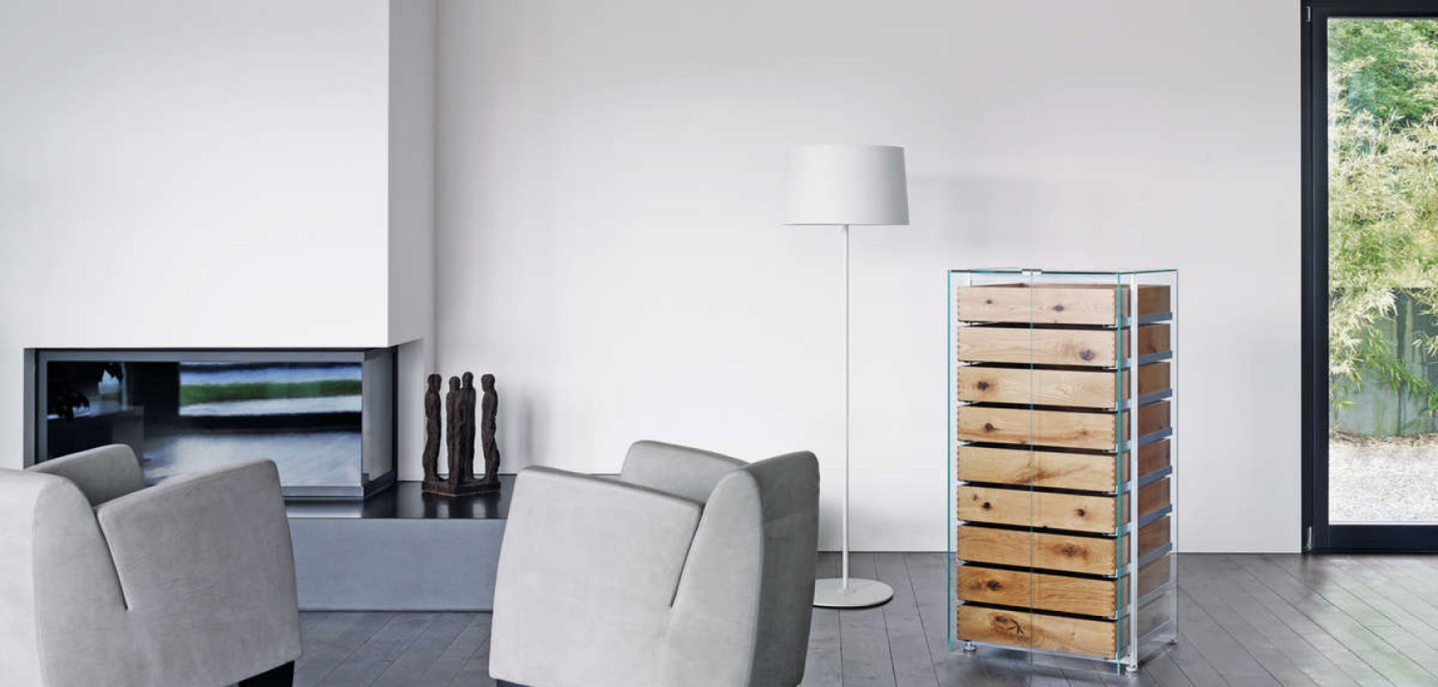 Der Schubladen-Container mit seiner vorgehängten Glasfassade zeugt von grossem Können – wie auch die saubere Polsterarbeit. Bild: Wellis Möbelfabrik AG