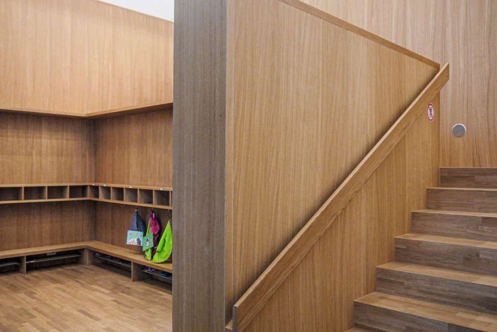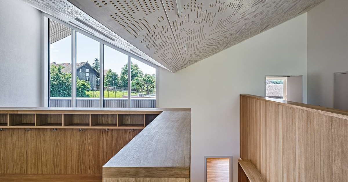 Schulhausbau. Holz prägt den Neubau eines Doppelkindergartens im zürcherischen Ebertswil. Im Zentrum der beiden Baukörper steht ein markantes Treppen- und Garderobengefüge. Es besticht durch seine reduzierte Formensprache und präzise Schreinerarbeit.
