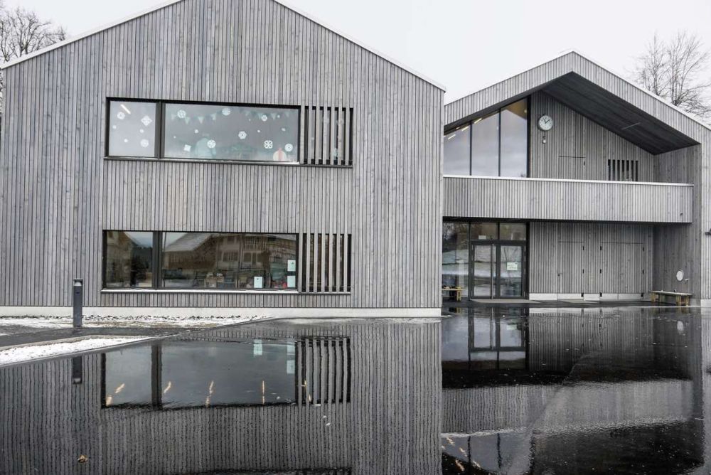 Für die Fassade des Holzrahmenbaus wurde sägerohe Lärche verwendet. «Die Vorverwitterung ist eine Lasur in Grau», sagt Petra Meng, Architektin beim Zürcher Architekturbüro Illiz. Im natürlichen Prozess werde die Lasur über die Zeit ausgewaschen, und eine natürliche Vergrauung setze ein. Die Fassadenschalung wurde auf Konter- und Hinterlüftungslattung sichtbar verschraubt. Der Entwurf kam der Bauherrschaft aus verschiedenen Gründen entgegen. Er berücksichtige den prognostizierten Bedarf an zwei Kindergarten- und einem Schulzimmer mit Nebenräumen, sagt die verantwortliche Gemeinderätin Beatrice Sommerauer. Im Weiteren wurde der Terrainversatz für ein zweistöckiges Gebäude genutzt. Dessen Gesamtvolumen wirkt so kleiner und ordnet sich in die Umgebung, bestehend aus Einfamilienhäusern, gut ein. Ausserdem wurden nachhaltige Baumaterialien verwendet und eine energieeffiziente Bewirtschaftung angestrebt.