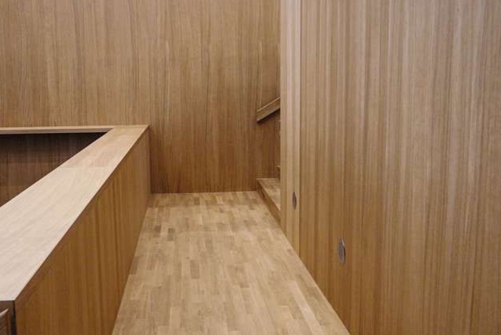 Eine Treppe, konstruiert aus Beton, ist das bestimmende architektonische Element zwischen den Etagen. «Die Verkleidung sowie die Einbauten bestehen aus Spanplatten, furniert mit europäischer Eiche und mit Brettcharakter», sagt Marco Morger, verantwortlicher Projektleiter der beauftragten Schreinerei Bimag AG. Grobplanung, Materialisierung und Oberflächenbehandlungen der Innenausbauten waren durch den Architekten vorgegeben, sodass es an den Schreinern lag, die Anpassung auf die vorhandenen Masse vorzunehmen. «Die Garderobeneinteilung konnte ohne grosse Designverluste umgesetzt werden», sagt der Projektverantwortliche. Rückwände, Ablagen wie auch Garderobenfächer wurden von der Schreinerei in verschieden grossen Elementen hergestellt und vor Ort montiert. Die Höhe der Garderobenelemente im Untergeschoss liegt bei 4,80 Meter. «‹Und so breit wie möglich›, war der Wunsch der Architekten gewesen», sagt Morger. Gebunden war man bei der Planung hinsichtlich der ab Werk vorgegebenen Plattengrössen. Und es sollte nicht zu viel Verschnitt entstehen. Das Ideal der Architekten war ein fugenloses Gesamtbild. «Der Stoss zwischen den einzelnen Rückwänden ist so minimal, dass er das einheitliche Gesamtbild nicht stört», sagt Morger.