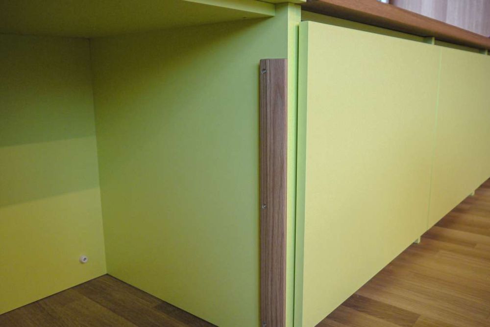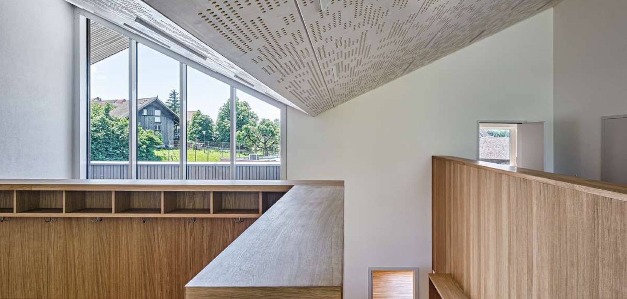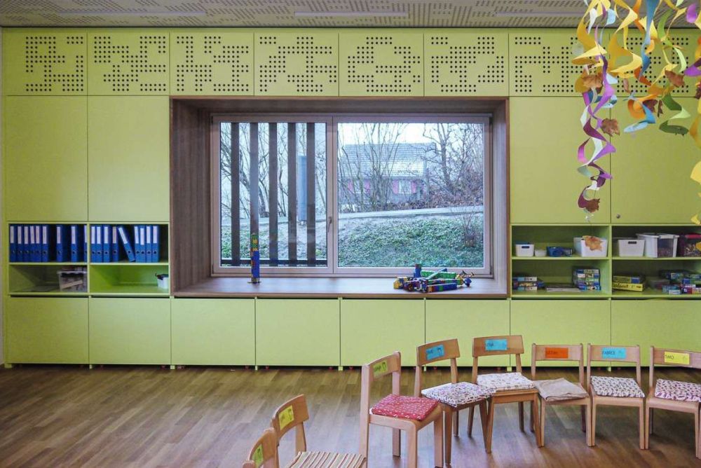 Die Fensterlaibungen aus Eiche haben laut Morger eine Tiefe von 1,07 Meter. Sie wurden ebenfalls geölt und sind mit einem Blattvorsprung gearbeitet. «Solche Details lösten wir zusammen mit den Architekten während der Planungsphase», sagt der Fachmann. Darunter befinden sich Schubladen auf Rollen, welche die Kinder einfach hin und her schieben können. Holzleisten beidseits der Korpusse erleichtern die Führung. Statt Griffen beliess man es bei Schlitzen – gross genug für Kinderhände. Die Farbe der beschichteten Frontplatten war kontrovers diskutiert worden, das frische Grün der Spanplatte von Swiss Krono behielt die Oberhand. Die obere, gelochte Reihe der Schrankfronten dient der Lüftung. Die Lochung folgt jener der Akustikelemente an der Decke. Bei diesen handelt es sich um vorfabrizierte Holzelemente des Typs «Silence 12» von der Firma Lignatur mit einem computergesteuerten Zufallsmuster.
