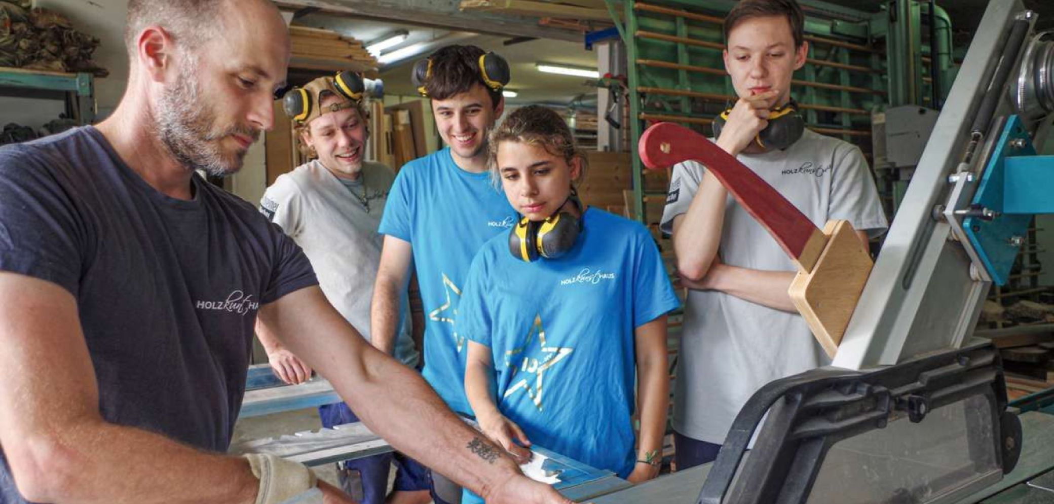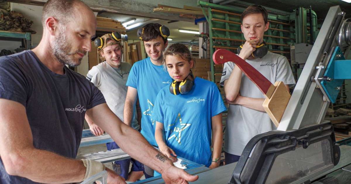 Vier der acht Jugendlichen, die gerade bei Holzkunsthaus eine Lehre machen, erzählen, wie das im Detail funktioniert.