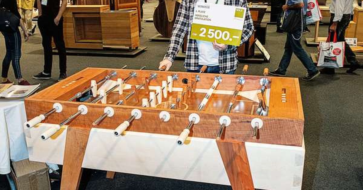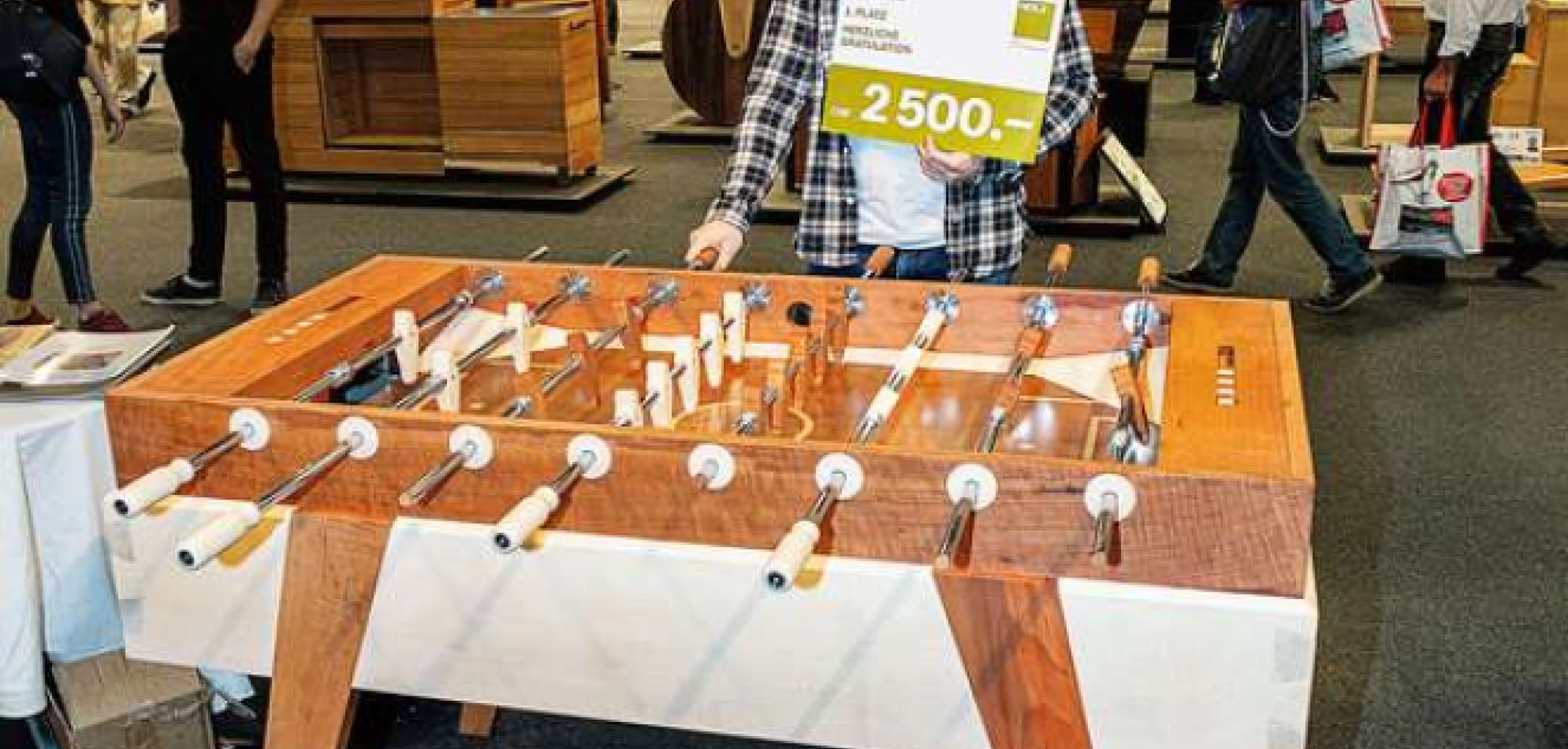 Dino Hediger aus Steinen SZ spielt gerne Tischfussball und nimmt an Turnieren teil. Für den Schwyzer Nachwuchswettbewerb hat er einen Töggelikasten aus Ahorn und Birnbaumholz gebaut. An der Messe Holz in Basel im Oktober gehörte der Kicker zu den 95 Exponaten, die um den Titel Schreiner-Nachwuchsstar buhlten. Den Messebesuchern gefiel der Töggelikasten am besten. Er erhielt am meisten Stimmen. «Das freut mich sehr», sagte der 20-Jährige. «Der Birnbaumstamm wurde 20 Jahre gelagert und ist über Umwege bei mir gelandet. Zum Glück hat die Länge gerade so gereicht.» Hediger hat während des dritten und vierten Lehrjahres 150 Stunden für Planung und Realisierung des Töggelikastens aufgewendet. Im Sommer hat er die LAP bestanden. «Vieles, zum Beispiel die Männchen, habe ich mittels CNC hergestellt. Das war eine Herausforderung.» Zudem sei der Kicker leimfrei, er habe alles zusammengesteckt und geschraubt. Die Siegerprämie für den Nachwuchsstar beträgt 2500 Franken.