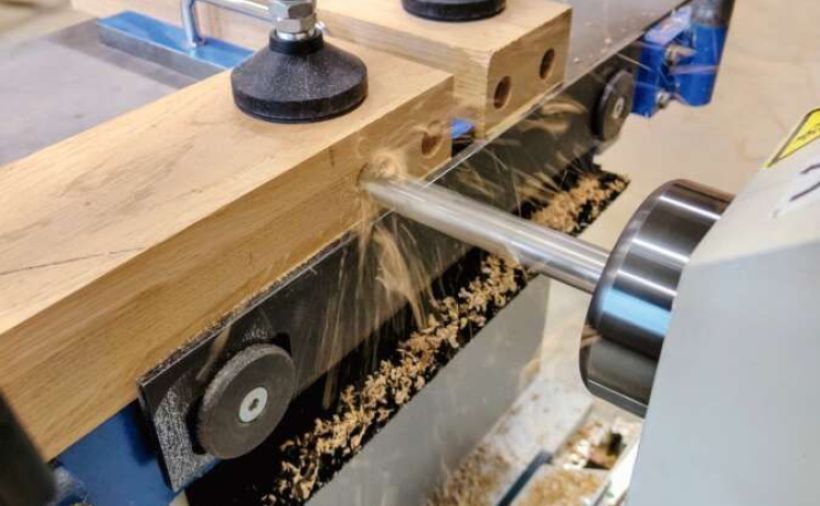 Ein Thema ist daneben die Bearbeitungsbreite der Marunaka. Diese beträgt im besten Fall 330 mm, verringert sich aber bei einer Verstellung des Messerwinkels. Dank der einseitig offenen Konstruktion der Maschine kann die Bearbeitungsbreite jedoch praktisch verdoppelt werden, indem man das Werkstück wendet und so auch den noch unbearbeiteten Teil hobelt.