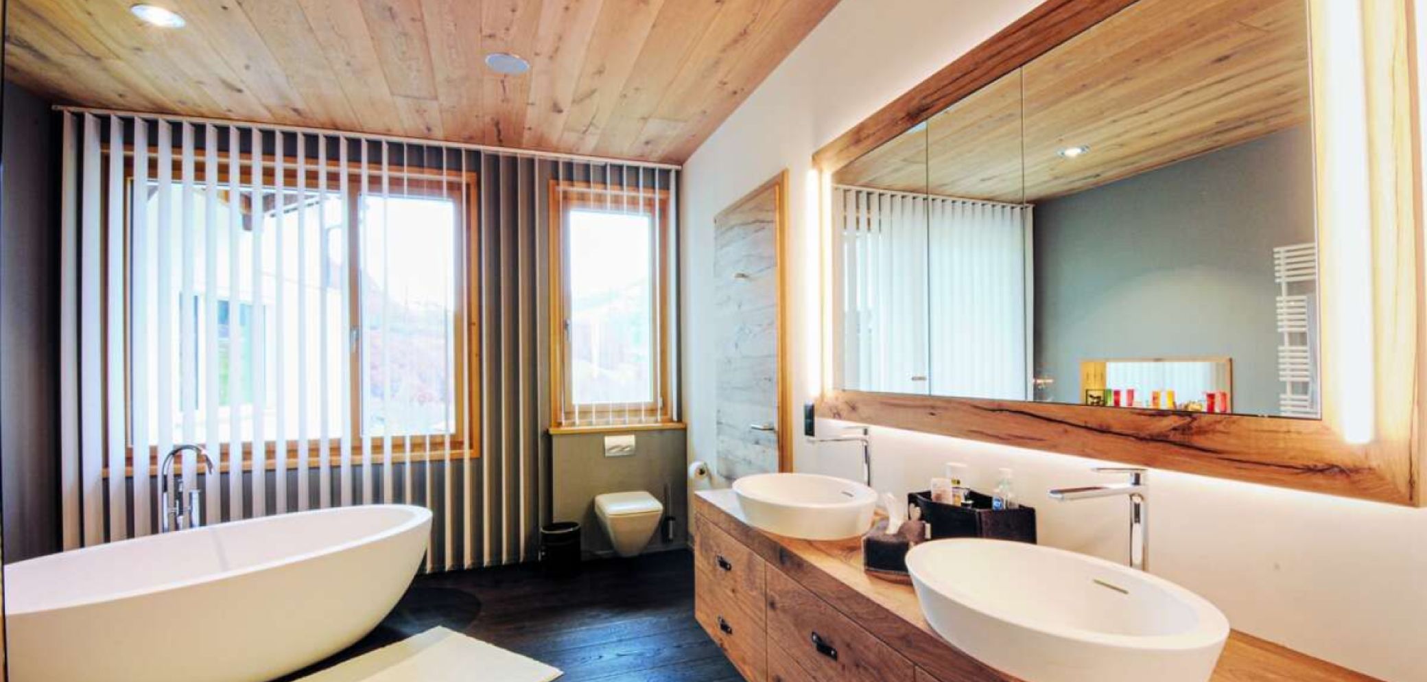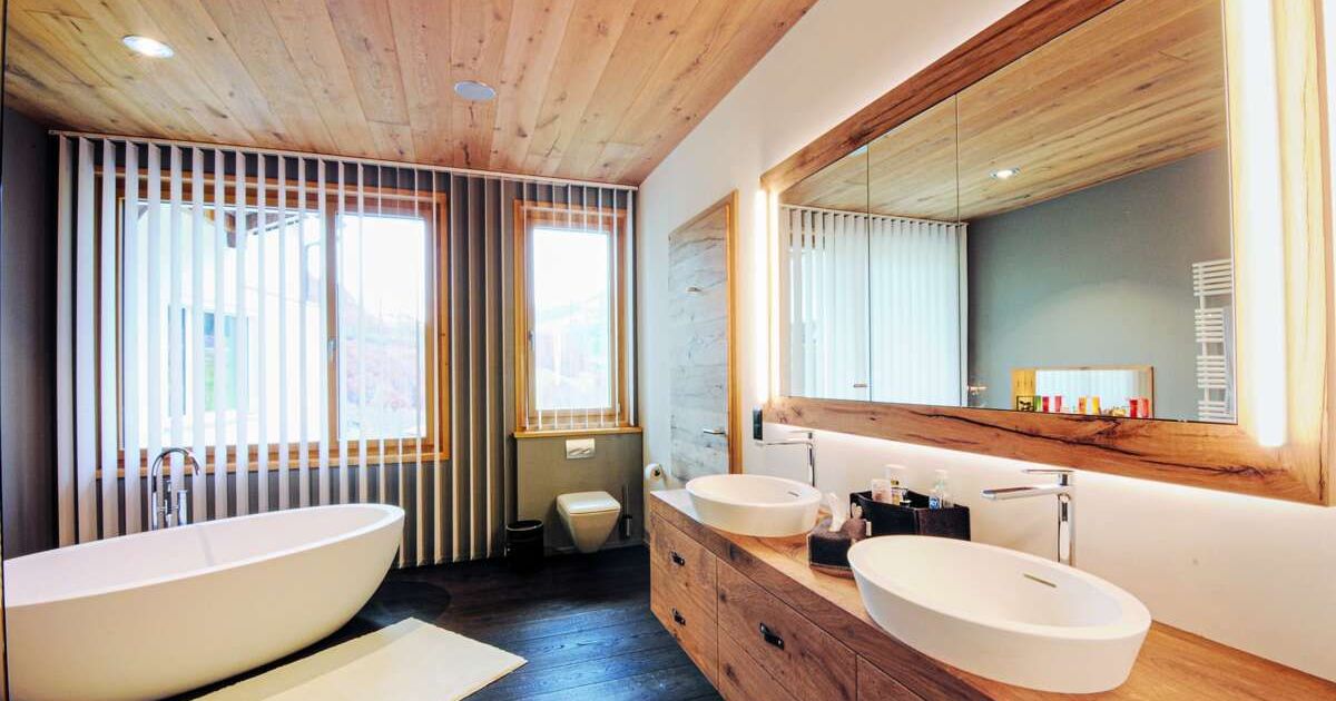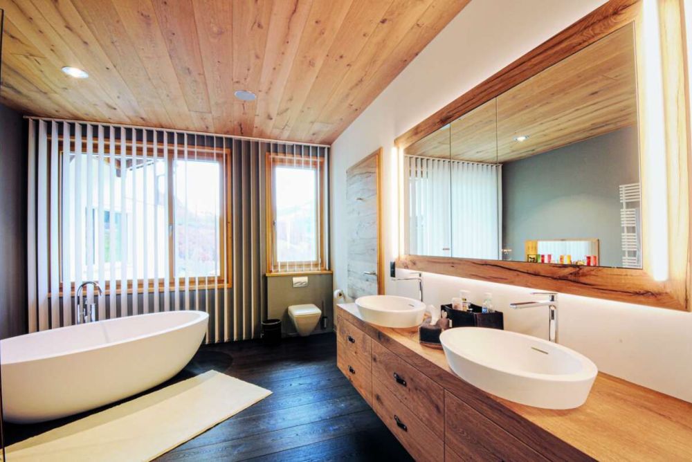 Im Bündnerland ist bei der Badgestaltung ein ähnlicher Stil gefragt wie im Kanton Wallis. Holz nimmt eine wichtige Rolle ein. Die Kaspar Flütsch Vitalmöbel AG in Klosters realisiert querbeet Bäder für Eigentumswohnungen, Einfamilienhäuser und natürlich auch Hotels und Ferienwohnungen. «Die Kundschaft ist durchmischt, Holz im Bad gefällt eigentlich allen», sagt Firmenchef Kaspar Flütsch. Entscheidend für das Gelingen sei einerseits die Grösse des Raums, andererseits die Frage, ob er über ein Fenster verfügt. «Kleine Bäder und solche ohne Fenster sind wegen der Feuchtigkeitsentwicklung nicht gleich gut geeignet für Holzelemente wie grosse mit Fenster.» Flütsch versucht, wenn immer möglich, auf eine Beschichtung des Holzes zu verzichten. So auch in einer Privatvilla im Raum Klosters. Das Badmöbel aus massiver Altholzeiche wurde einzig von Hand gehobelt. «Durch den sauberen Schnitt entsteht eine leicht glänzende Oberfläche, die robuster und pflegeleichter ist als eine geschliffene Oberfläche.» Man könne sie hin und wieder mit Seife abwaschen, was sie zusätzlich schütze. «Klar ist aber, dass man Wasser- und Zahnpastareste nicht lange darauf liegenlassen soll, denn dann entstehen Flecken.» Doch diese Gefahr bestehe nicht bei Kundinnen und Kunden, die ein solches Möbel wünschten. Den Boden haben die Schreiner mit einem Parkett aus geräuchter, geölter Eiche ausgeführt. Das hat sich bewährt. «Man steigt nicht klatschnass aus dem Bad und steht direkt auf das Holz, sondern legt ein Tuch aus, das einen grossen Teil der Feuchtigkeit aufnimmt.» Die Tropfen, die auf dem Parkett landen, lassen sich mit wenig Aufwand wegwischen.