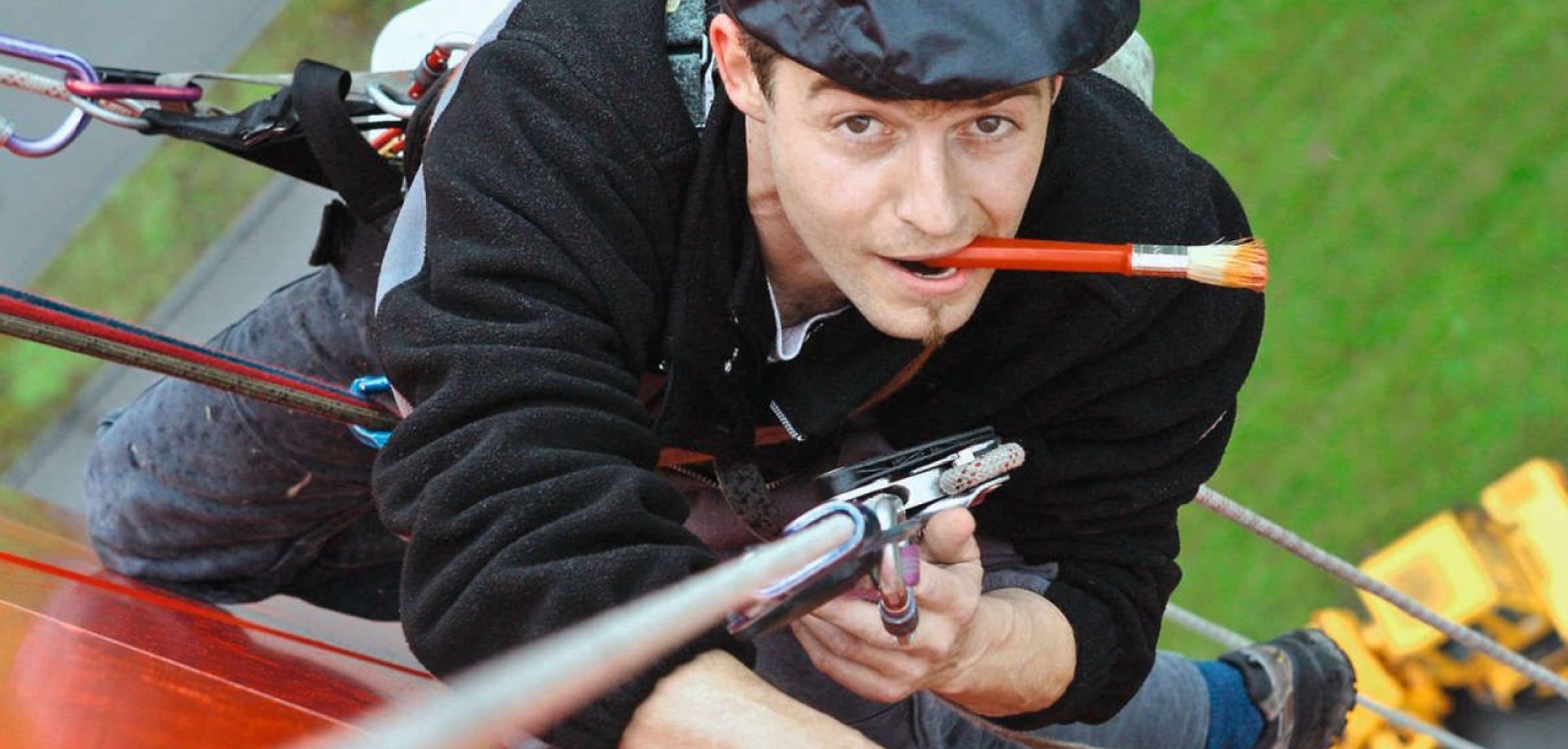 Der 49-Jährige ist Gewerbekletterer, und auch diese Berufsbezeichnung ist seine Eigenkreation. «Ich habe eine ganze Weile überlegen müssen, welcher Begriff meine Arbeit am besten umschreibt», sagt er. Kein Wunder angesichts der Vielfalt: Ob im Fussballstadion Basel eine Werbefolie in schwindelerregender Höhe anbringen, Fassaden oder Silos reinigen, eine eingeklemmte Fahne unter dem Zeiger der Kirchturmuhr herausschneiden, Skulpturen aufhängen, Brücken restaurieren, Storen montieren, Bahnhoffassaden flicken – die Liste seiner Aufträge ist lang. Jeder Job bedeutet eine neue Herausforderung, manchmal kann es auch gefährlich werden. Genau das gefällt dem Pionier: «Man muss sich dabei einiges überlegen – und genügend Biss haben», sagt er und erzählt, wie er neulich mit seinen Mitarbeitern bei 40 Grad Hitze ein Silo innen gereinigt hat. «Nach drei Stunden bist du fix und fertig.» Dabei hat gerade Höhener mehr als genug Biss. Je kniffliger und anspruchsvoller sich ein Auftrag gestaltet, desto mehr kommt er in Fahrt.