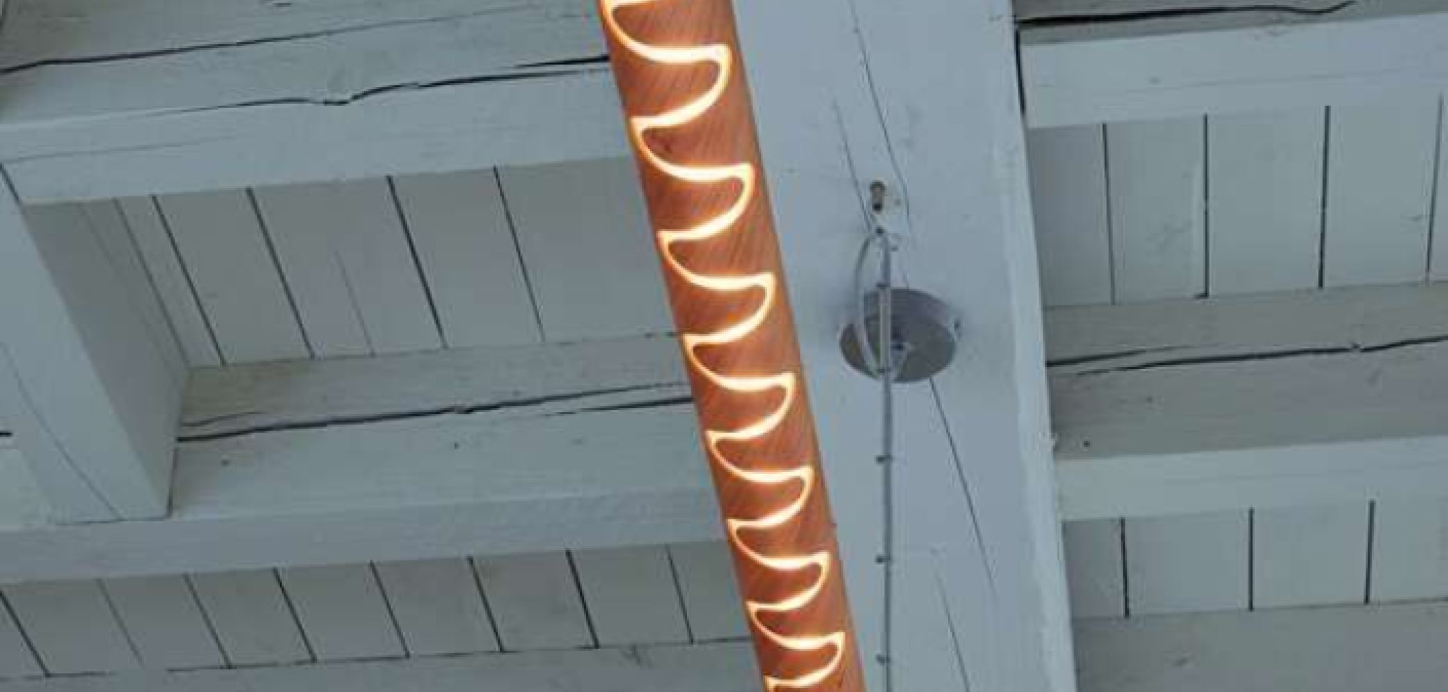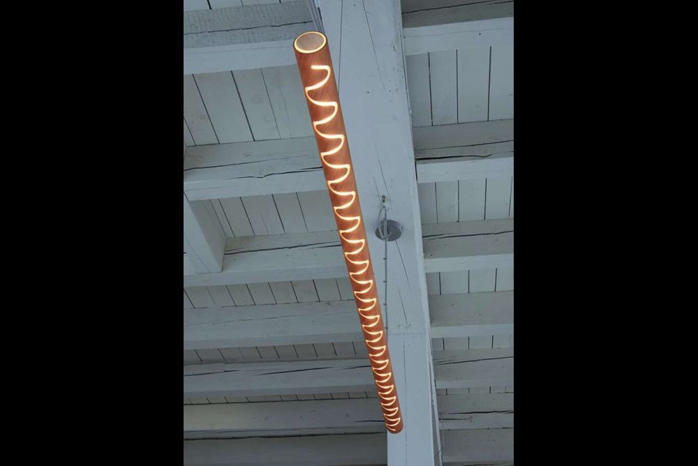 Die dimmbare Pendelleuchte Sinus1 von Ryterdesign verfügt über einen Aussenkörper aus mehrschichtig verleimtem Holzfurnier mit einer Decklage aus Kirschbaum. Die Firma bietet damit eine Leuchtenalternative aus Holz, welche mit ihrer runden Form einen neuen Akzent setzt. Das Licht wird von einem innen liegenden Opalplexirohr gestreut und leuchtet durch die gefräste Sinuskurve nach unten. Die Lampe ist 1500 mm lang und hat einen Aussendurchmesser von 55 mm. Mit 2700 Kelvin entspricht die Lichttemperatur dem, was es zu einem gemütlichen Essen als Tischbeleuchtung braucht, und mit den laut Hersteller 2500 Lumen pro Laufmeter stimmt auch die Helligkeit. Die gesamte Technik ist innerhalb der Röhre verbaut, was die schlichte Form unterstreicht.