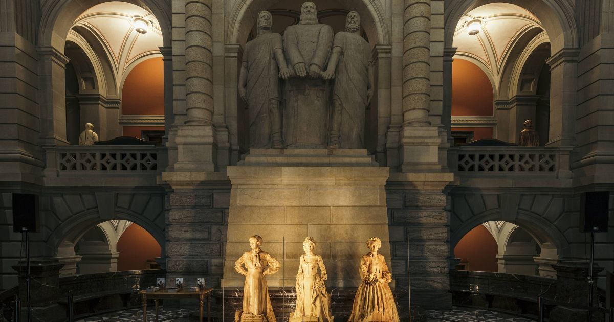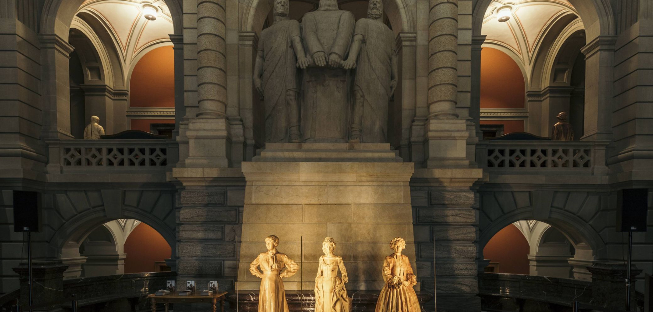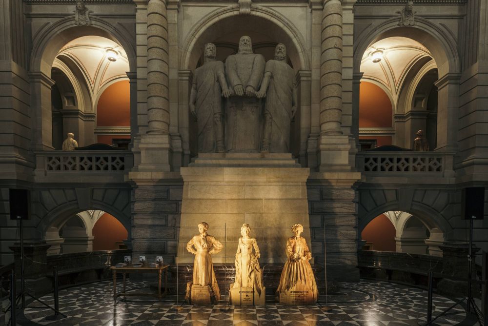 Gilberte de Courgenay, Johanna Spyri und Marie Tussaud vor den drei Eidgenossen unter der Bundeshauskuppel. Bild: Woodvetia