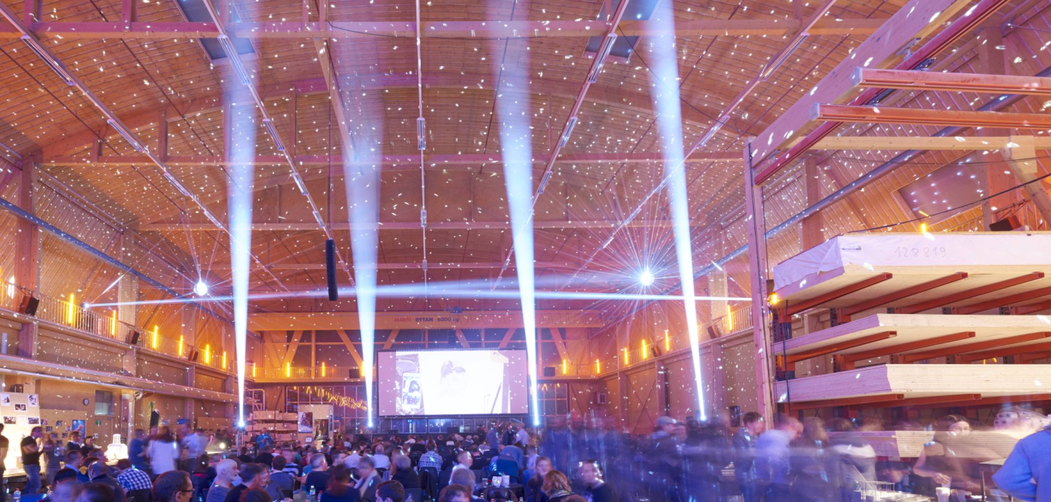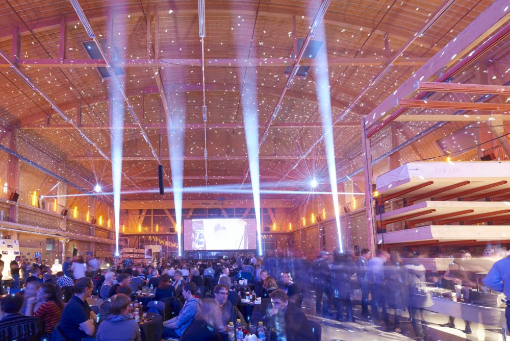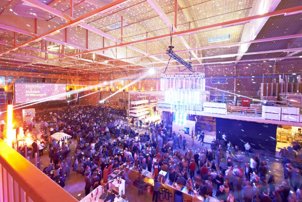 Die hölzerne Werkhalle verwandelt sich jeden Winter in ein Kino. Bild: Hector Egger Holzbau AG