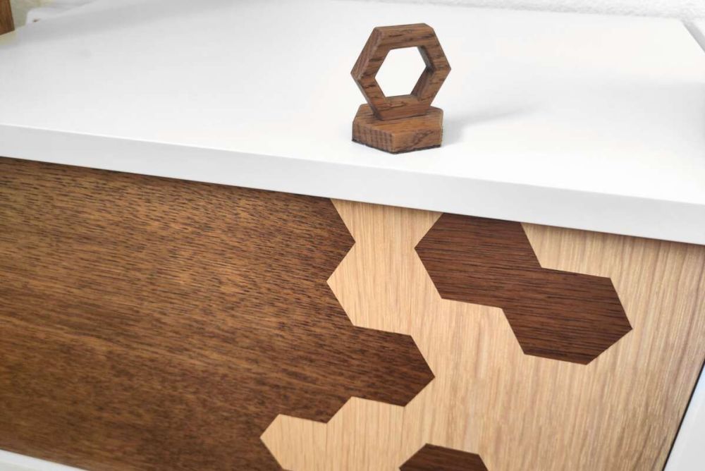 Auch bei dem Beispiel unten wurden zwei Magnete verbaut. Allerdings in einer stärkeren Ausführung, da der Griff rein magnetisch hält. Eine Haltekraft von jeweils 20 kg sorgt dafür, dass die auf Laufleisten geführte Schublade auch mit schwerem Inhalt bewegt werden kann. Auch wenn kein Möbelschloss verbaut wurde, kann die Schublade ohne den magnetischen Griff nicht geöffnet werden, da die Fronten in geschlossenem Zustand gegenüber dem Korpus zurückstehen. Bei der Gestaltung des Griffes wurde das Wabenmuster aus der Marketerie aufgegriffen.