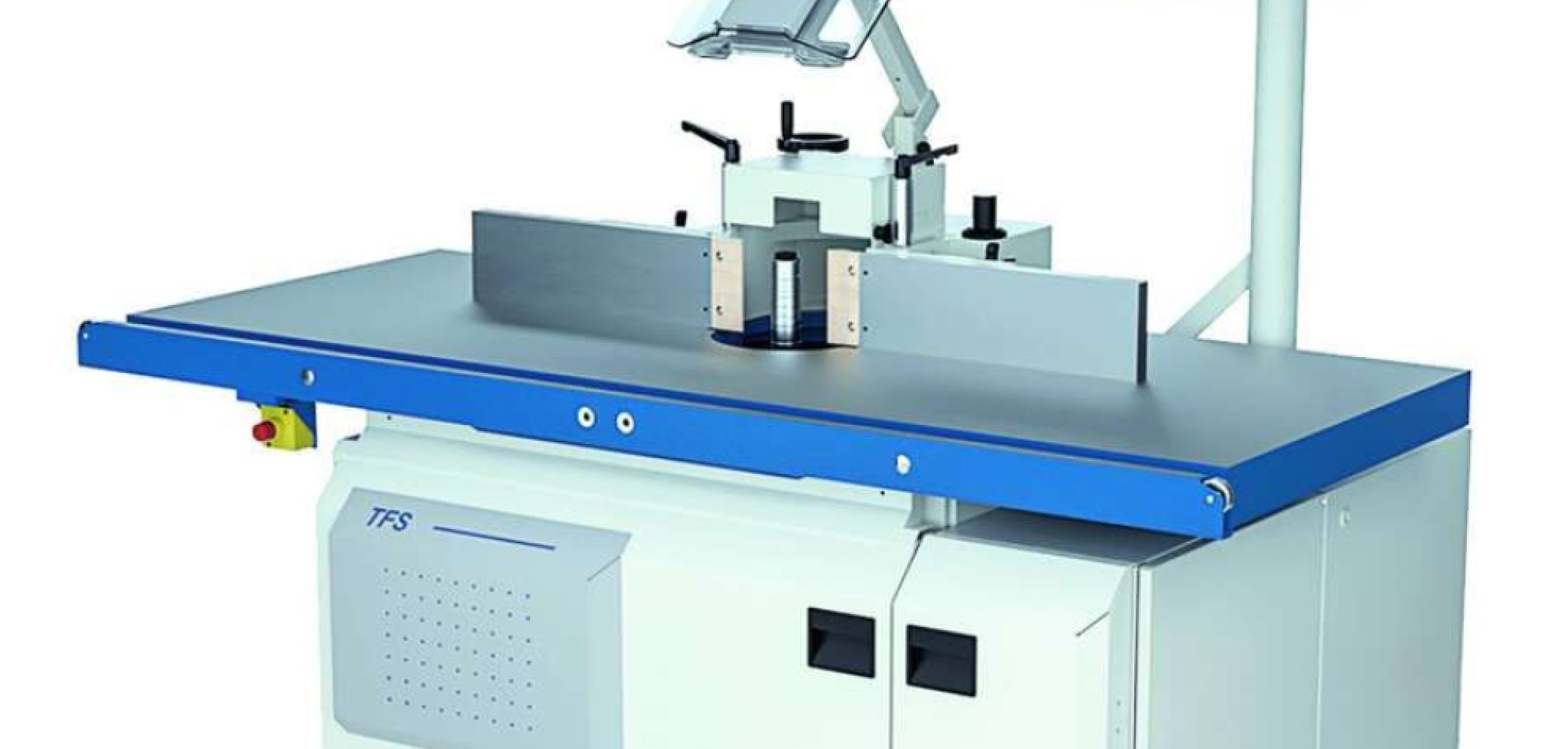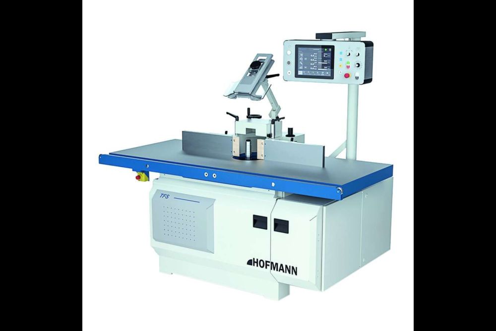 Die Kehlmaschine TFS 1260 des deutschen Anbieters Hofmann verfügt über das Fräsdorn-Schnellwechselsystem HSK-F63 und ist mit einer CNC-Steuerung ausgestattet. Die Maschine ist entweder mit zwei gesteuerten Achsen (Höhe und Winkel) oder mit drei gesteuerten Achsen (Höhe, Winkel und Anschlag) erhältlich. Bedient wird die Maschine über einen 12,1 Zoll grossen Touchscreen. Dieser überwacht unter anderem die Klemmung der Anschlagbacken, stellt die programmierten Werkstückdaten grafisch dar, löst und bedient die HSK-Schnittstelle und verwaltet die Werkzeugdaten. Der Schwenkbereich der Spindel mit Direktantrieb deckt den Bereich von –47 bis +47 Grad ab, und für den Spindelstart ist eine stufenlose Drehzahlvorwahl möglich. Für den schnellen Werkzeugwechsel des HSK-F63-Systems befindet sich hinter dem Fräsanschlag eine integrierte Werkzeugwechselstation. In der Schweiz werden Maschinen von Hofmann über die Ineichen AG im luzernischen Ermensee vertrieben.