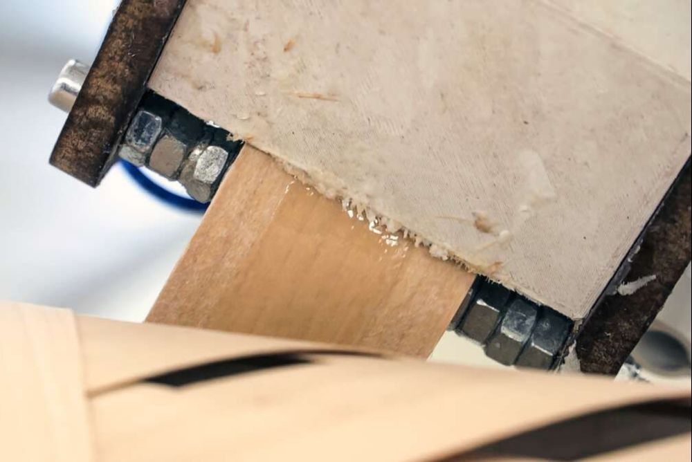 Beim Projekt «3DWoodwind» haben sich die Forscher, als Material zum Wickeln, für schmale, endlos verbundene Furnierstreifen aus Buche entschieden, womit dessen statische Materialvorteile bedingt genutzt werden können. Die Holzfasern sind schliesslich intakt, durchgängig und somit auch zugfest. Als Kern, den man umwickeln kann, sollte eine Tragstruktur aus dünnen Multiplexplatten dienen. Im Gegensatz zu Fasermaterial ist Furnier steifer und nicht in jede Richtung problemlos biegbar. Die Streifen müssen sich somit flach und faltenfrei um die Tragstruktur wickeln und miteinander verkleben lassen, damit die maximal mögliche Belastbarkeit erreicht wird. Das sowie die statischen und dynamischen Kräfte bestimmen die erforderliche Formgebung eines solchen Bauteiles mit.