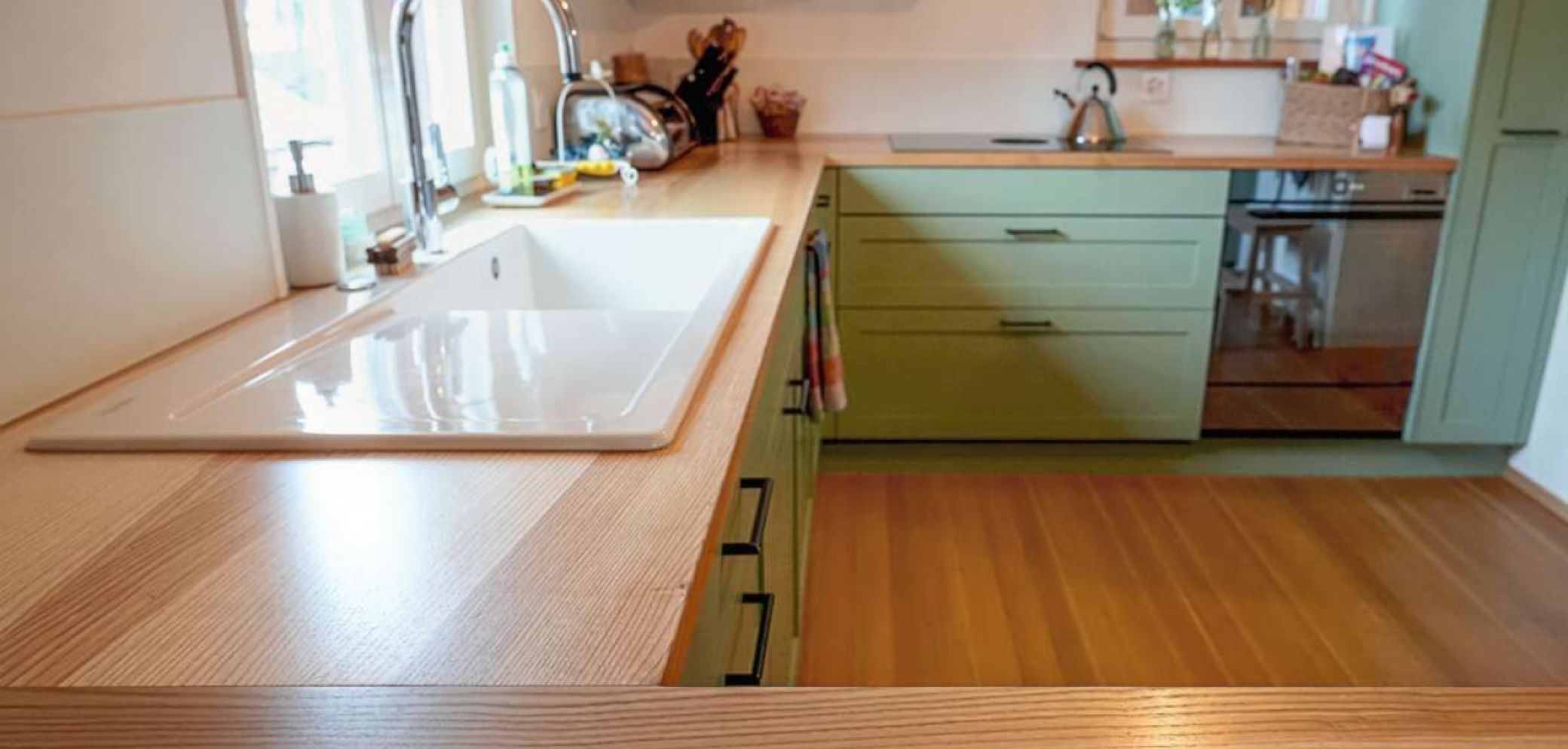 Bei Familie Hutter aus Cham ZG steht eine solche Küche. «Inspiriert wurden wir dazu von einer Ferienwohnung, die mit einer alten Holzabdeckung ausgestattet war. Diese war schon richtig dunkel und gebraucht, was uns aber sehr gefiel. Eine Steinabdeckung wollten wir nicht, weil fast jede Küche einen Stein hat. Und Chromstahl war für uns zu industriell, zudem störten uns die Geräusche, die darauf entstehen», sagt Bettina Hutter. Entstanden ist nun in Zusammenarbeit mit der Schreinerei Welz AG eine Küche im Landhausstil. Die gestemmten Ahornfronten wurden lindengrün lackiert, die Abdeckung aus Esche mit Braunkern ausgeführt, die dann von der Schreinerei zweimal mit Hartöl behandelt wurde. «Unsere Massivholzabdeckungen ölen wir, zudem geben wir den Kunden ein Pflegeset und eine Gebrauchsanleitung mit», sagt Welz. Um das Holz im Bereich des Geschirrspülers gegen den austretenden Dampf zu schützen, wurde an der Unterseite der Platte eine Kunststoffabdeckung aufgeklebt. Die Stösse der drei Arbeitsplatten wurden lamelliert und vor Ort schliesslich miteinander verleimt. Das Glaskeramik-Kochfeld und das Waschbecken montierte die Schreinerei jeweils aufgesetzt. «Dadurch ist die Armatur nicht mit der Holzabdeckung, sondern mit dem Waschtisch verbunden, was den Wasserkontakt minimiert. Zudem hat ein vorstehendes Glaskeramik-Kochfeld den Vorteil, dass man eine heisse Pfanne auch mal über den Rand schieben kann, ohne dass das Holz darum sich gleich verfärbt oder gar verbrennt. So gesehen, erzielen wir damit einen konstruktiven Holzschutz», sagt Reto Welz.