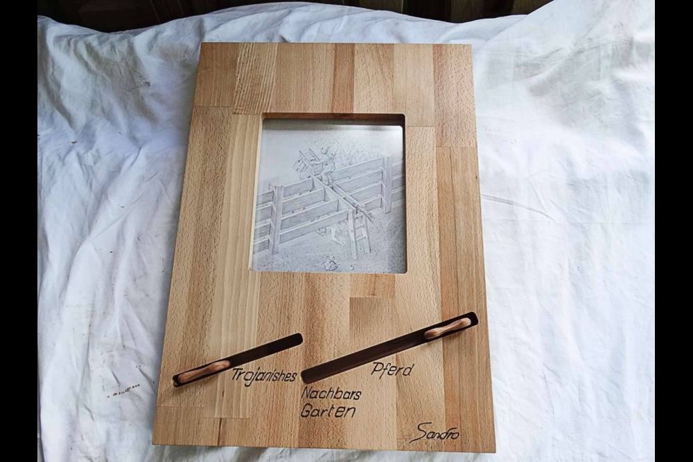 In einem nächsten Schritt montierte er die verbindenden Gewindestifte nach einem ausgeklügelten Prinzip. Schliesslich waren es ja drei Platten aufeinander. Eine feste, auf der sich alles bewegt. Dahinter zwei Verschiebeplatten, eine mit den Delfinen und der Flasche, die zweite mit dem Liebespaar. Klingt verwirrend. Ist es auch.