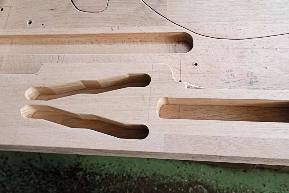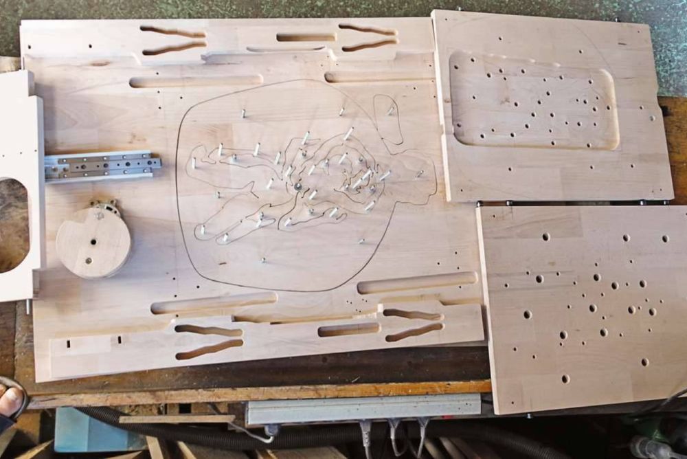 In die stehenden Hölzer fräste Fritz Kobel 13,5 Millimeter breite Kurven. Später würden in deren Verlauf die Kurvenrollen (Kugellager) auf und ab fahren und die beweglichen Platten in der Tiefe verschieben.