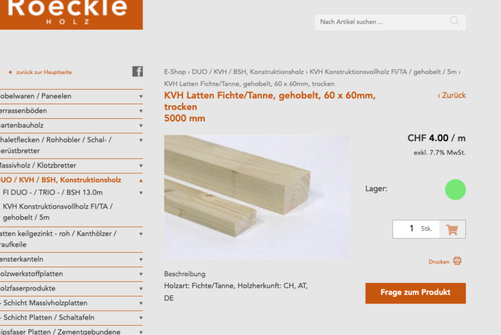 Die Einstiegseite zum Webshop ist aufgeräumt wie ein gut sortiertes Holzlager. Linkerhand ist das Menü mit den verschiedenne Produktkategorien, durch die man sich einfach durchklicken kann. Oder man klickt auf das entsprechende Bild auf der rechten Seite des Bildschirm und kommt auch so rasch zur gewünschten Kategorie. Dort angelangt, gilt es eine Auswahl unter den verschienden Produkten zu treffen. Wer weiss, was er will, kommt da rasch zum Ziel. Wer unsicher ist, kann auch zunächst eine Anfrage schicken, ohne sogleich bestellten zu müssen. Ein brandaktuelles Thema ist derzeit die Verfügbarkeit von Holz und Holzwerkstoffen. Hier schafft bei Roeckle ein Ampelsystem Klarheit. Trägt das Produkt einen grünen Punkt, ist es rasch verfügbar, Orange signalisiert Lieferfristen und Rot Lieferprobleme. Wer bereits Kunde und registriert ist, der loggt sich mit seinem Passwort ein. Es ist aber auch möglich, als Gast ohne Registrierung zu bestellen.