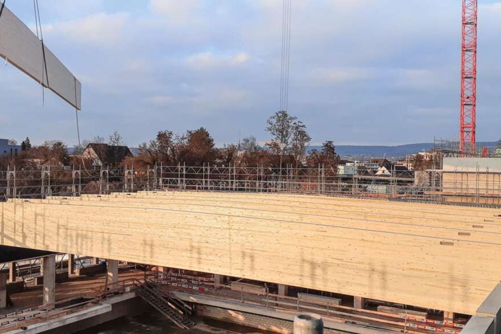 Zu welchen fast gigantischen Konstruktionen das Unternehmen bereits beitrug, sieht man auf dessen Homepage. Der Transport von Bremgarten AG bis zur Baustelle war eine abenteuerliche Reise. Zahlreiche Schaulustige, die den gut 30 Meter langen Sattelschlepper begleiteten, kamen voll auf ihre Kosten. Ihnen bot sich ein spezielles Spektakel, als sich das Ungetüm seinen gut 70 Kilometer langen Weg durch zum Teil enge Gassen und Kreisel bahnte und schliesslich im Rückwärtsgang in die Baustelle einfuhr. In einer weniger abenteuerlichen Aktion wurden auch 255 Kubikmeter Brettsperrholzplatten als Sekundärtragwerk angeliefert. Diese verbinden die Träger und bilden die Dachscheibe. Darunter wird später eine Deckenverkleidung aus Metallplatten montiert. «Schöner wäre Holz gewesen, aber das ist natürlich Sache des Architekten und auch voll okay», sagt Urs Schuler und erklärt, dass die Tragkonstruktion die Basis für ein Flachdach bildet. Dazu kommt auf eine dampfsperrende Bitumenschicht eine Wärmedämmung, eine wassersperrende Schicht und dann die Kiesschicht. Auch eine 1890 Quadratmeter grosse Photovoltaikanlage findet auf dem Dach Platz.