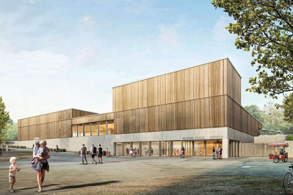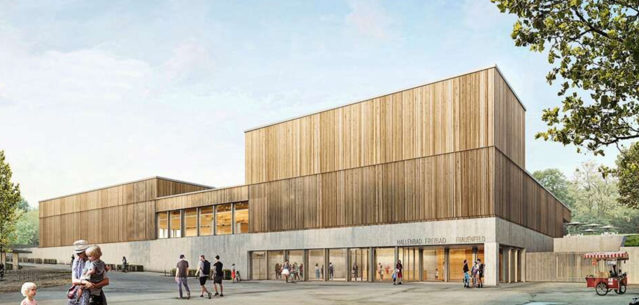 Im Frühling 2019 führte die Stadt Frauenfeld einen Projektwettbewerb durch. 70 Vorschläge gingen ein. Es siegte «Tag am Meer». Dieses Projekt hatte die Christian Koller Architekten AG aus Baden AG eingereicht. Unter anderem punktete der Vorschlag durch die harmonische und filigrane Einbettung in die umgebende Natur, sprich, durch den hölzernen Auftritt. Zwar sind der Sockel, der unter anderem den Eingang und die Garderoben beherbergt, sowie die Innenwände des Badegeschosses aus sichtbelassenem Beton. Aber auf diesem Sockel ruht dann die Konstruktion aus Holz, bestehend aus mächtigen Trägern und einer Dachplatte in Holz. Die Fassaden der Badehalle mit Restaurant umhüllt eine hinterlüftete Holzverschalung.