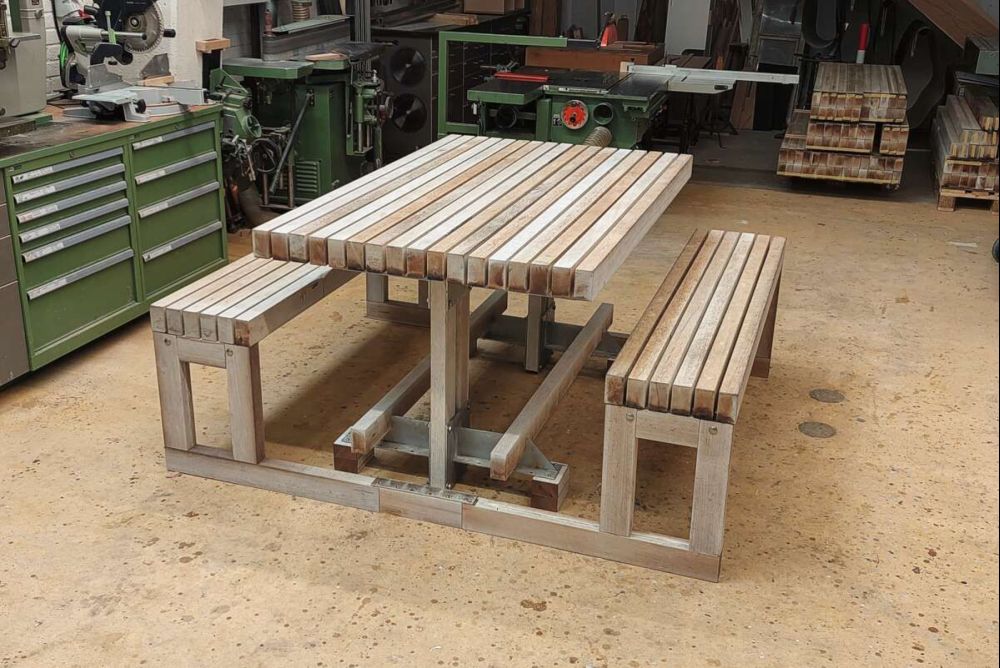 Konkret bedeutet das 60 Laufmeter zu jeweils 6 Holzlatten, mit dem Querschnitt 90 mal 52 Millimeter hochkant. Das aussereuropäische, harte und witterungsbeständige Holz hat eine Rohdichte von 750 bis 850 Kilo pro Kubikmeter. Diesen wertvollen Rohstoff wollte Hunziker retten und so die Erinnerung an das alte Hallenbad wachhalten. Die Demontage fand behutsam statt. Es wurde nichts zersägt oder verändert. Selbst die weisse Patina, entstanden durch Chlor oder Kalk, bürstete der Schreiner nicht aus. Aus dem so gewonnenen Hallenbadholz entstanden Garnituren, die jetzt schon lokalen Kultstatus haben. Jedenfalls sitzt man bereits in drei Frauenfelder Restaurants an diesen Tischen und Bänken.