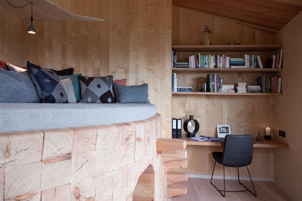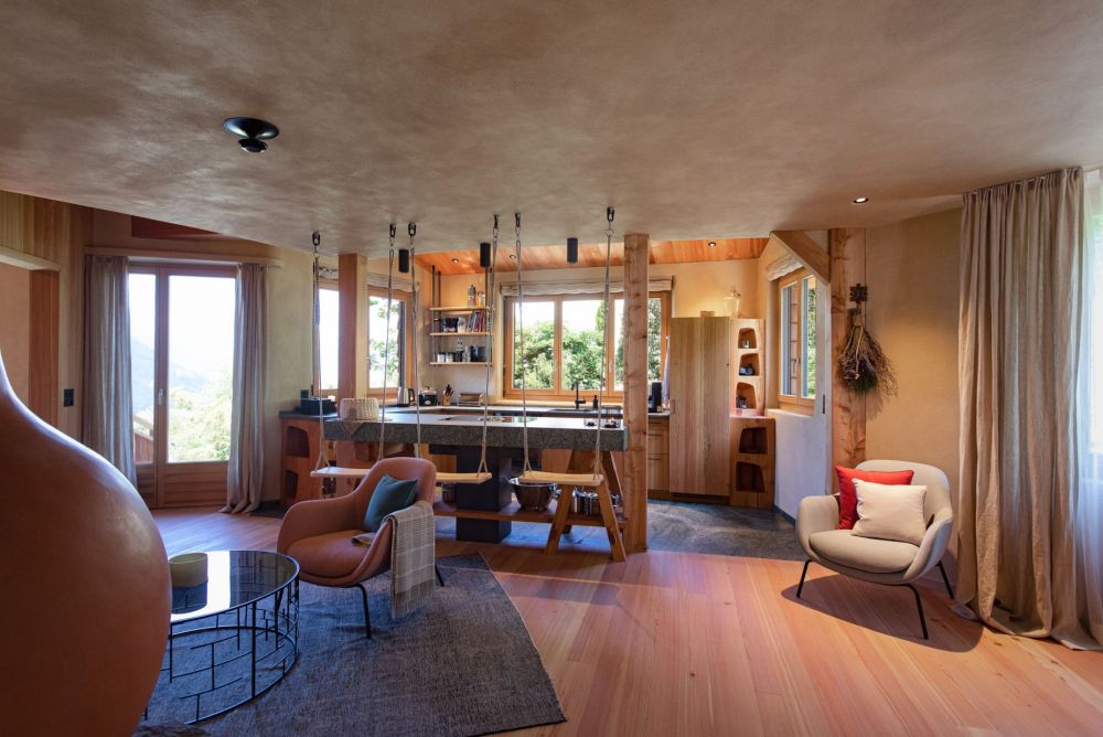 Die Nachhaltigkeit in der Bauweise spiegelt sich in der Inneneinrichtung wider. Urs Kasper, Unternehmer und Schreiner, wählte Möbel, Stoffe und Accessoires, die dem Konzept entsprechen – nachhaltig, ökologisch und fair produziert. Nicht nur das Haus, sondern auch die Möbel sind komplett leimfrei konstruiert.