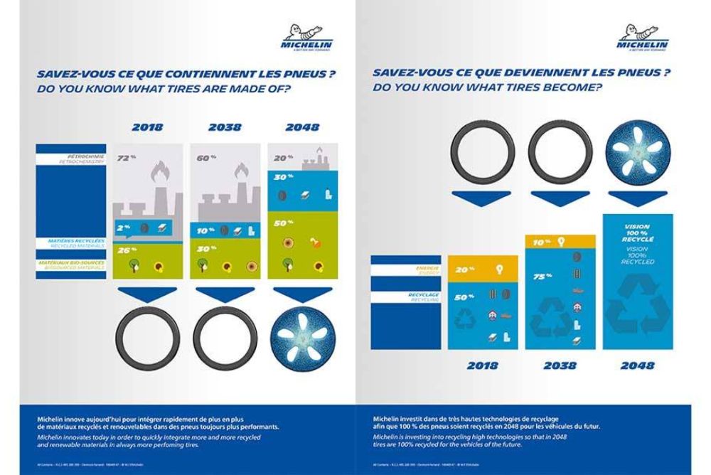 Michelin will bis zum Jahr 2048 seine Reifen zu 80 Prozent aus nachhaltigen Materialien fertigen. Um dieses hochgesteckte Ziel zu erreichen, investiert der Reifenproduzent kräftig in die Forschung. Gesucht werden Rohstoffe auf biologischer Basis. Ein Beispiel hierfür ist die Produktion von synthetischem Kautschuk aus Biomasse, wie etwa Holz, Stroh oder Rüben.