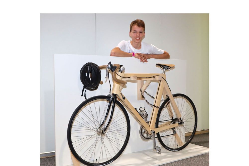 Lino Landolt posiert mit seinem Holzvelo. Bild: PD