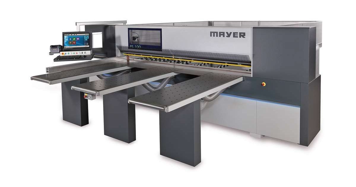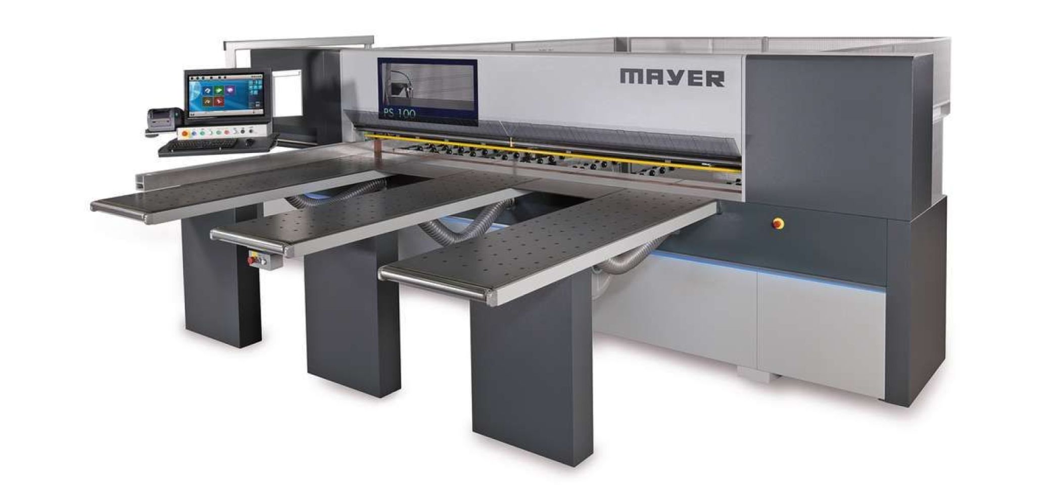 Mit der Plattenaufteilsäge PS 100 setzt Mayer gemäss eigenen Angaben neue Standards in der professionellen Mittelklasse bei horizontalen Plattenaufteilsägen. Sie ist für das schnelle und massgenaue Zuschneiden von Einzelplatten und Plattenpaketen bestimmt. Das Modell verfügt über ein durchdachtes Maschinenkonzept und zahlreiche Detaillösungen, die jede Anforderung genau auf den Punkt bringen. Sie hat einen stabilen Maschinenkörper, eine Motorstärke von 18 kW und einen Sägeblattüberstand von 118 mm. Der präzise Antrieb über ein Zahnrad- und Zahnstangensystem, das kaum verschmutzt werden kann, sorgt für eine grosse Laufruhe des Sägewagens mit Vorritzaggregat bei Schnittgeschwindigkeiten von bis zu 130 m/min. Auch der Druckbalken mit variabler Öffnungshöhe, das unabhängige Messsystem, die bedienerfreundliche Steuerung und einiges mehr verhelfen zu guten Ergebnissen.