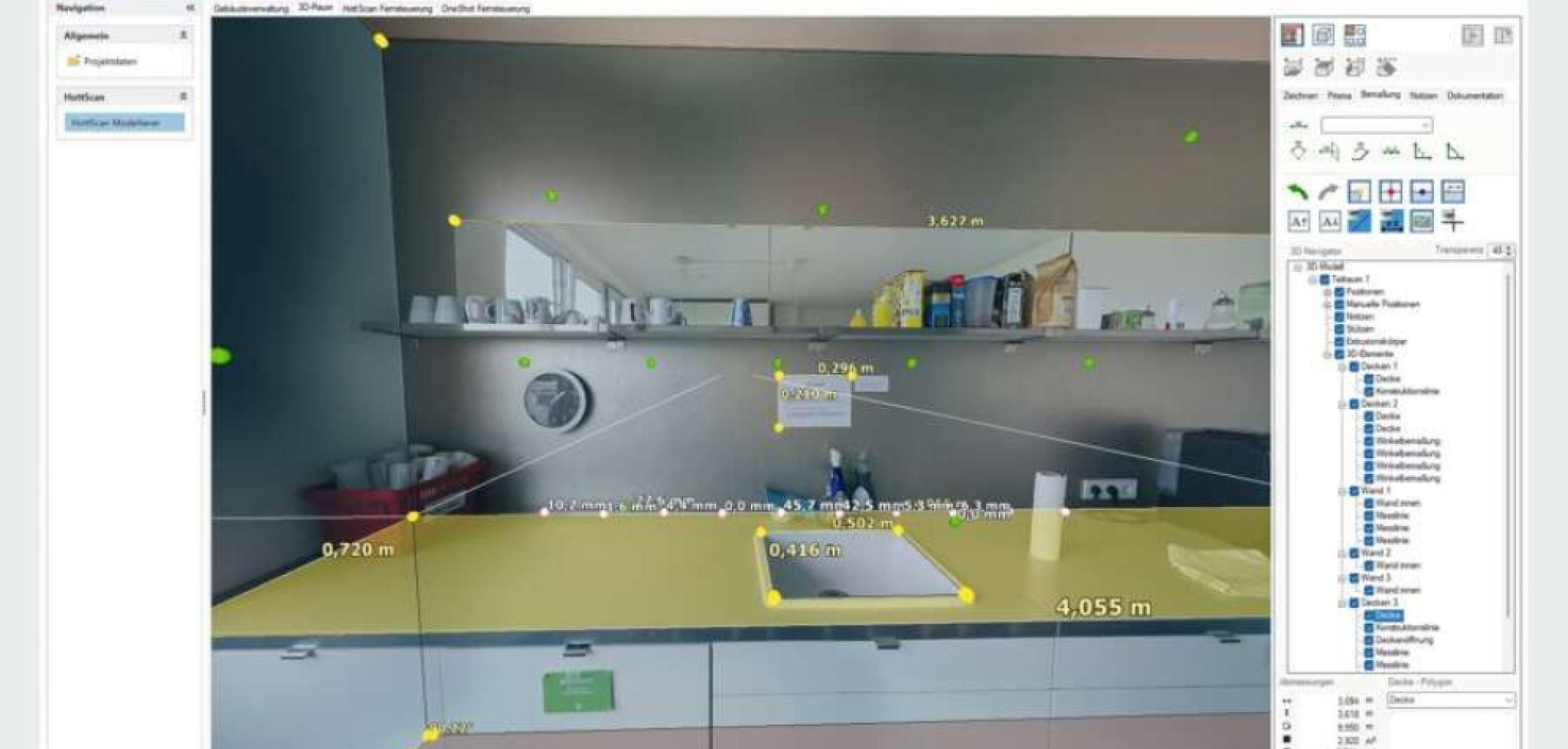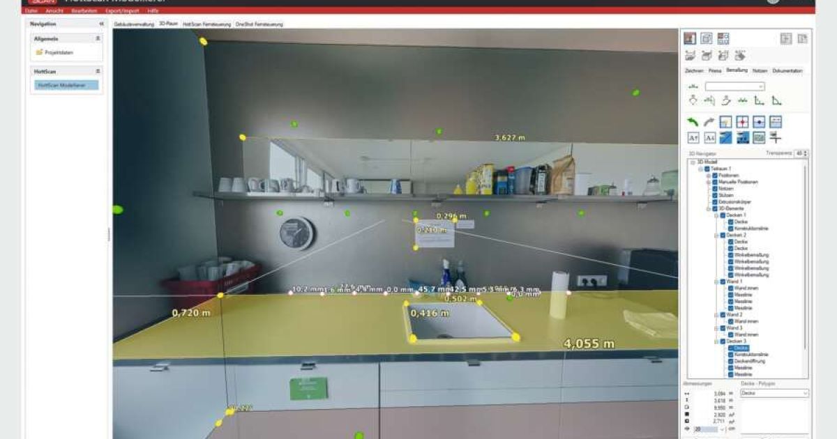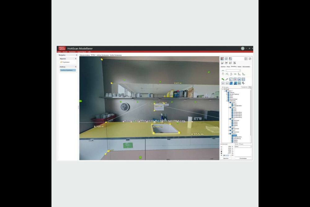 Der 3D-Raumscanner von Hottscan vereint modernste Lasertechnik mit 360°-Panoramen und erstellt detaillierte 3D-Scans von Räumen mit und ohne Küche. Mithilfe der Tachymeterfunktion können sowohl automatische Messreihen als auch manuelle Punkte in kürzester Zeit erfasst werden. Das Highlight, beispielsweise für die Küchenplanung, ist die automatische Horizontierung durch den integrierten Neigungssensor. Der Scanner braucht keine Messpunkte mehr für die Ausrichtung, denn er erkennt die Lage im Raum automatisch und gleicht Schiefstellungen selbst aus, funktioniert also wie eine elektronische Wasserwaage. Die Egi-Schnittstelle wird zusätzlich durch eine detaillierte Fotodokumentation erweitert. So können Planer auch im Nachhinein alle relevanten Informationen nachvollziehen und weitere Begehungen vermeiden. Auch bei den Messreihen setzt der Hersteller nach eigenen Angaben neue Massstäbe: Auf einer definierten Ebene wird eine festgelegte Anzahl von Messpunkten in gleichbleibendem Ab- stand erfasst. Zeigt eine Wand einen Knick, eine Welle oder eine andere Verformung, zeigt das interaktive Scanprogramm diese frühzeitig an und stellt zuverlässige Daten bereit. Im Anschluss lassen sich die aufbereiteten Raumdaten direkt in eine gängige Küchenplanungssoftware importieren oder in einem anderen Format der Wahl exportieren.