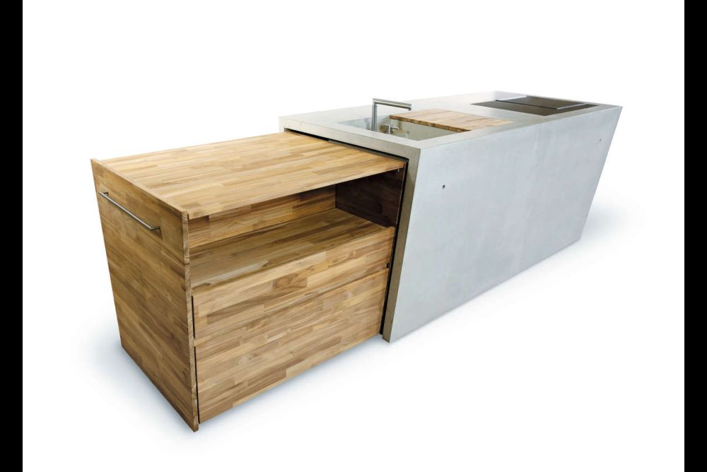 Neben einer Vielzahl von Produkten, bei denen im Grunde einfach die Grillstation etwas erweitert wurde und so auch eine Rüstfläche zur Verfügung steht, ist es die Modulbauweise, die in Entwürfen häufiger gedacht wird. Der Vorteil liegt auf der Hand: Je nach Kundenbedürfnis kann die Aussenküche individuell zusammengestellt werden und bis zu einer komplett ausgestatteten Küche anwachsen, die dann hinsichtlich der Funktionalität einer Wohnküche kaum nachstehen muss. Durch die Modulbauweise lassen sich auch Ecklösungen einfach realisieren. Die Montage auf Dachterrassen ist möglich, da die einzelnen Module relativ leicht und klein sind und sich so durch die Dachausstiege transportieren lassen. Dann meist fest installiert, verbleibt die Modulküche auch während der kalten Jahreszeit vor Ort und muss entsprechend eingepackt und vor der Witterung geschützt werden. Ebenso fest installiert sind in der Regel die Küchenblöcke. Dies nur schon wegen des Gewichts, wie etwa der neue Entwurf von Dade-Design. Der Küchenblock «The Concrete» mit zwei Metern Länge in Beton lässt sich mit einem Auszug aus Holz auf drei Meter verlängern und bringt es so auf das stattliche Gewicht von 700 Kilogramm. Am Stück geliefert, wird der Block mittels Kran und vier Lastanker-punkten platziert. Eine vollständige Küche für den Garten zu erschaffen, war auch der Anspruch des Designers Michael Schmidt, der für OCQ den Küchenblock «bbqube» entworfen hat. «Wenn man nur den Grill auf der Terrasse stehen hat, muss man für alle anderen Dinge und Abläufe beim Kochen und Grillieren ständig nach drinnen gehen», so Schmidt.