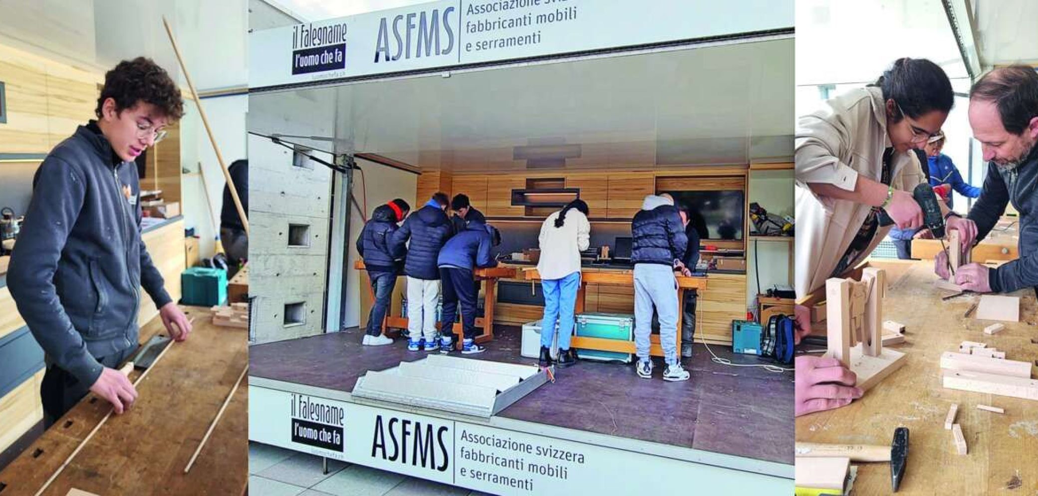 La giornata di martedì 7 marzo è stata particolare per gli allievi di terza e quarta della Scuola media Locarno, una giornata di orientamento professionale che ha offerto l’opportunità a ragazzi e ragazze di partecipare a quattro ateliers pratici e quindi di conoscere da vicino alcuni mestieri. Il falegname non ha perso questa occa- sione per avvicinare i giovani al mondo «dell’uomo che fa» da una postazione privilegiata qual è il rimorchio promozionale dell’ASFMS e con un testimonial speciale: un apprendista del secondo anno che ha scelto di essere falegname proprio grazie a eventi come quello di Locarno. Per l’associazione essere pre- senti a queste giornate ha una rilevanza importante in quanto permettono – come rileva il presidente Renato Scerpella – di coinvolgere «i giovani in attività che ne attestano le capacità manuali e creative con l’obiettivo evidente di risvegliare in loro il desi-derio di seguire un apprendistato nella nostra bella professione che come tutte le professioni ha bisogno di forza nuova per continuare ad avere un futuro». CA
