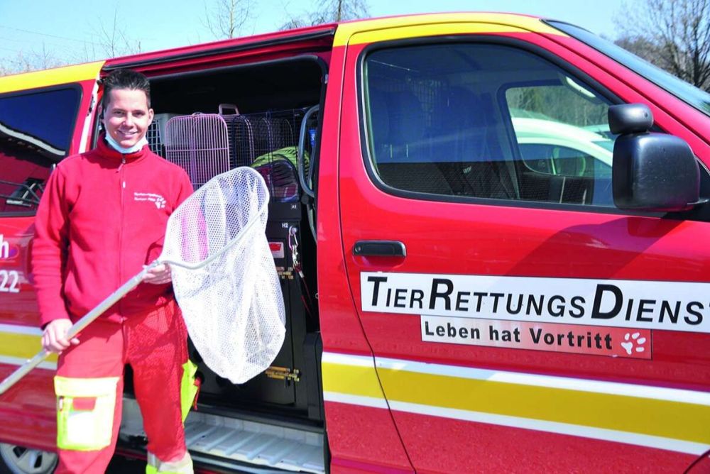 Der Einsatz an jenem Vormittag ist ganz in der Nähe von Patrick Hubers Arbeitsort Winkel ZH gelegen – 20 Minuten Fahrt zeigt das Navi an. Mit einem Headset ausgerüstet, über das der Tierrettungsfahrer ständig erreicht und zu neuen Einsätzen gerufen werden kann, fährt er los. Das Innenleben des roten Kombis mit der Aufschrift «Tierrettungsdienst» ist beeindruckend: In Boxen können Kleintiere transportiert werden – von Hunden über Katzen bis zu Schildkröten, Igeln, Eichhörnchen und Greifvögeln. In der Ablage sind neben einem Sanitätsrucksack Utensilien zu finden wie dicke Handschuhe, Weidekörbe und Wärmepads für Wildvögel, ein grosses Netz zum Einfangen von Wasservögeln, kleinere Netze zum Einfangen von Katzen, Sauerstoffglocken, allerlei Leinen sowie Tragbaren für Hunde. Die Fahrt führt durch mehrere Ortschaften in der Nähe des Zürcher Flughafens. «Kein Tag ist wie der andere», sagt Huber. «Heute ist es ruhig. Aber es gibt Zeiten, in denen ich bis zu vierzig Einsätze pro Tag habe und am Ende meiner Schicht vollkommen verschwitzt im Büro ankomme.» Der 28-Jährige ist mit Leib und Seele Tierrettungsfahrer bei der Stiftung Tierrettungsdienst. Er schildert die Einsätze so lebhaft, dass man sich diese beim Zuhören bildhaft vorstellen kann. «Einmal rief eine Bauernfamilie an und erklärte, dass eine verwilderte Katze eingeklemmt sei. Vor Ort sah ich dann, dass die Katze in einer Heutrocknungsanlage gefangen war. Nach drei Stunden und bei 35 Grad gelang es mir schliesslich, sie mit einer Fangschlinge aus der Anlage zu befreien.»