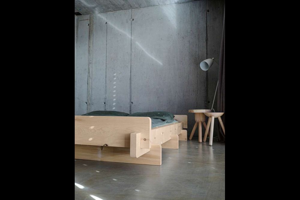 Wolke 7 lautet der passende Name für das Bett des gelernten Schreiners Ralph Steiner aus Tscherlach SG. Er ist im Rahmen seines Labels Raïna auch als Gestalter tätig und hat sich das Ziel gesetzt, Arbeiten aus Arvenholz eine moderne Formensprache zu verleihen. Beim Bett Wolke 7 ist ihm das zweifellos gelungen. Die Konstruktion aus unbehandeltem Arvenholz besteht aus sieben Brettern, die lediglich im Sinne einer Überblattung zusammengesteckt werden und so nicht nur die Fassung für ein geeignetes Bettsystem, sondern gleich auch den Sockel beziehungsweise die Rostauflage bilden. Durch seine Konstruktion ist das Bett werkzeuglos aufzustellen und – bei Betten ein wichtiger Aspekt – nach Bedarf auch wieder zerlegbar. Wolke 7 benötigt weder Beschläge noch Leim. Die einzelnen Bretter sind ganz aus dem Baum geschnitten. Dass sie sich auch bei kleinen Feuchtigkeitsveränderungen nicht biegen, sei vor allem der sorgfältigen Holztrocknung zu verdanken, erklärt Steiner. Zudem sei das Holz der Arve – auch Königin der Alpen genannt – in dieser Hinsicht «gnädig», weil ruhig. Die herstellende Schreinerei Frars Hohenegger aus Fuldera GR weist rund 100 Jahre Erfahrung im Umgang mit Hölzern aus der Region auf. Das Holz der Arve gehört dazu.