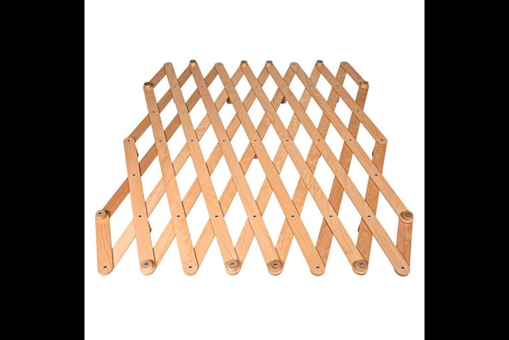 Das Scherenbett 990 von Thut Möbel kommt gänzlich ohne einen begrenzenden Rahmen aus. Hier bilden die Fläche des Scherengitters sowie die daran angebrachten Noppen die Begrenzung. Diese kann variieren: Dank dem Scherenprinzip verändert man den Gitterrost nämlich nach Bedarf kinderleicht in seiner Grösse. Das erlaubt dem Benutzer, zwei Matratzen aufeinanderzustapeln und bei einem allfälligen Besuch das Bett zu einem Doppelbett auszuziehen und die Matratzen nebeneinander zu le- gen. Oder anders ausgedrückt: Durch das Schichten der Matratzen kann aus einem Doppelbett ein Einzelbett oder eine Sitzgelegenheit entstehen. Wenn man das Bett vollends auszieht, ist es auch möglich, zwei Matratzen längs hintereinander auf dem Gitterrost zu platzieren. Wer das Bett ganz zusammenfaltet, der kann es bequem transportieren.