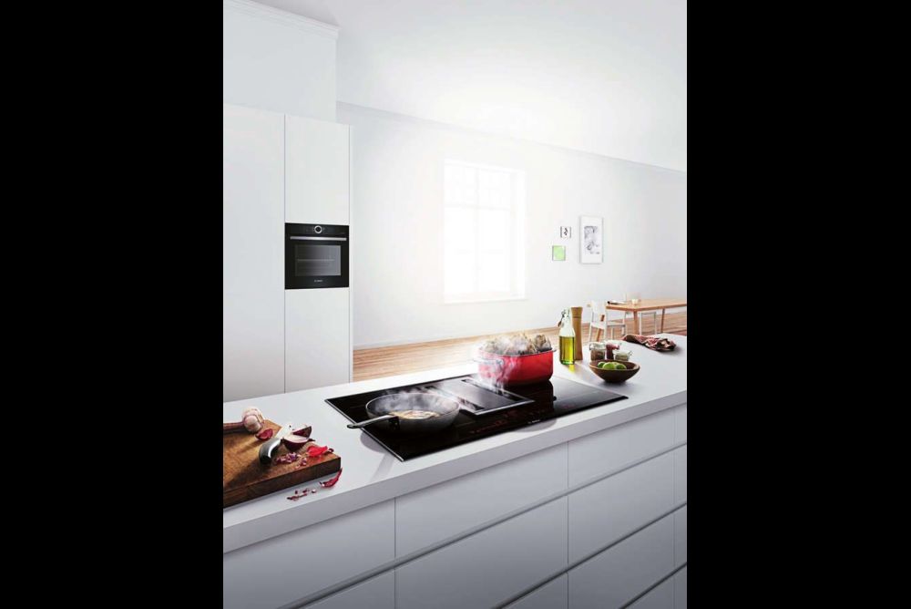 Seit Jahren hält der Trend zu offenen Küchen an. Das Kochfeld befindet sich dabei meist im Zentrum des Geschehens, oft integriert in eine Kücheninsel oder eine dem Raum zugewandte Arbeitsfläche. Wer hier kocht, will mittendrin statt nur dabei sein und den Blick auf den Wohnraum sowie die Kommunikation mit der Familie oder den Gästen ungestört geniessen. Eine grossformatige Dunstabzugshaube wäre da nur im Weg. Vor diesem Hintergrund präsentiert Bosch eine passende Lösung: Das Induktionskochfeld der «Serie 8» mit integriertem Abzugsmodul ist ein Multitalent, das moderne, sensorgesteuerte Lüftungstechnologie mit zeitgemässer «FlexInduction» und Koch- und Bratsensorik vereint. Es passt sich an das Küchendesign an und schafft nicht nur neue Perspektiven beim Kochen, sondern schon bei der Küchenplanung.