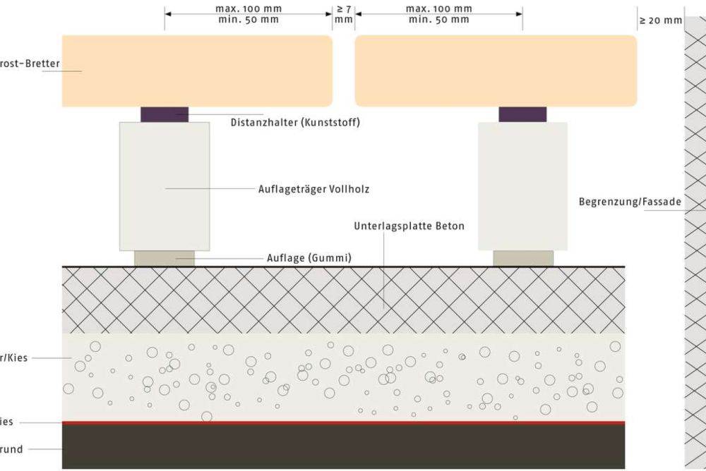 Als Auflager für die Unterkonstruktion haben sich einfache Betonplatten bewährt. Diese verteilen die Last der Konstruktion auf den Boden, sind dauerhaft und können auch als Befestigungspunkte, etwa für höhenverstellbare Standfüsse, genutzt werden, um Niveauunterschiede des Untergrundes auszugleichen. Stehen die Auflageträger direkt auf den Sockeln, erweisen sich Gummi- Pads als hilfreiche Zwischenschicht.