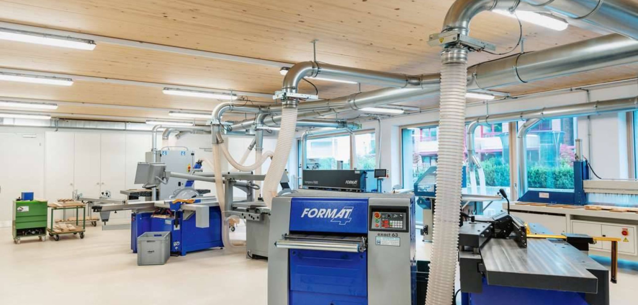 Die überbetrieblichen Kurse für die Zimmerer- und Schreinerlernenden finden im ver-grösserten Holzbildungszentrum unter dem gleichen Dach statt. Besonders beeindruckend ist die hohe Werkhalle für die Zimmerleute, die mit einem Hallenkran und einem Elementbautisch ausgestattet worden ist. Daran schliesst sich im Erdgeschoss direkt der lichtdurchflutete Maschinenraum mit seinem raumhohen Fensterband an, der von den Schreinern und Zimmerleuten gemeinsam genutzt wird. Um den Lernenden in den neuen Räumlichkeiten eine zeitgemässe Ausbildung mit einer modernen Infrastruktur anbieten zu können, wurde der Maschinenpark von beiden Verbänden grösstenteils erneuert. Zwei helle Bankräume ergänzen das Angebot im Holzbildungszentrum. Die Aufstockung in Holzelementbauweise bietet Raum für Schulungsräume und ein Lehrerzimmer.