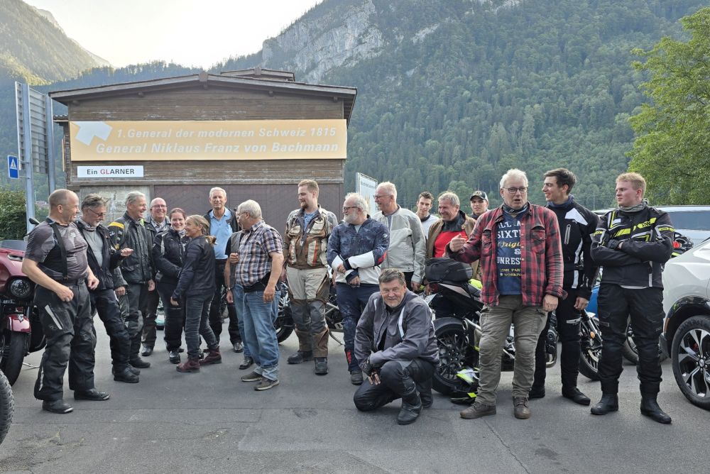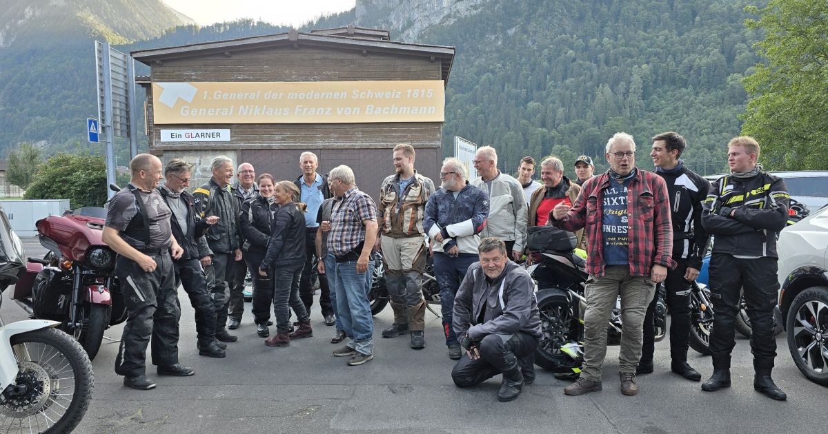 Aufgestellte Schreiner-Motorradfahrerinnen und -fahrer beim abschliessenden Gruppenbild im Glarnerland. Bild: PD