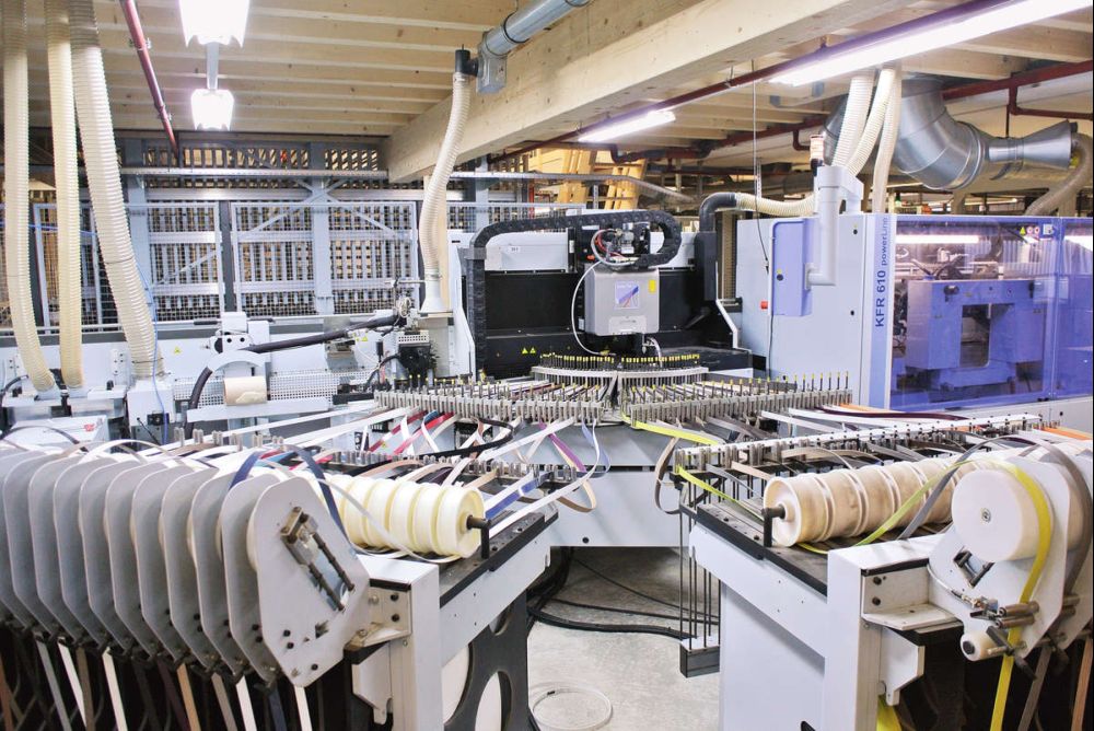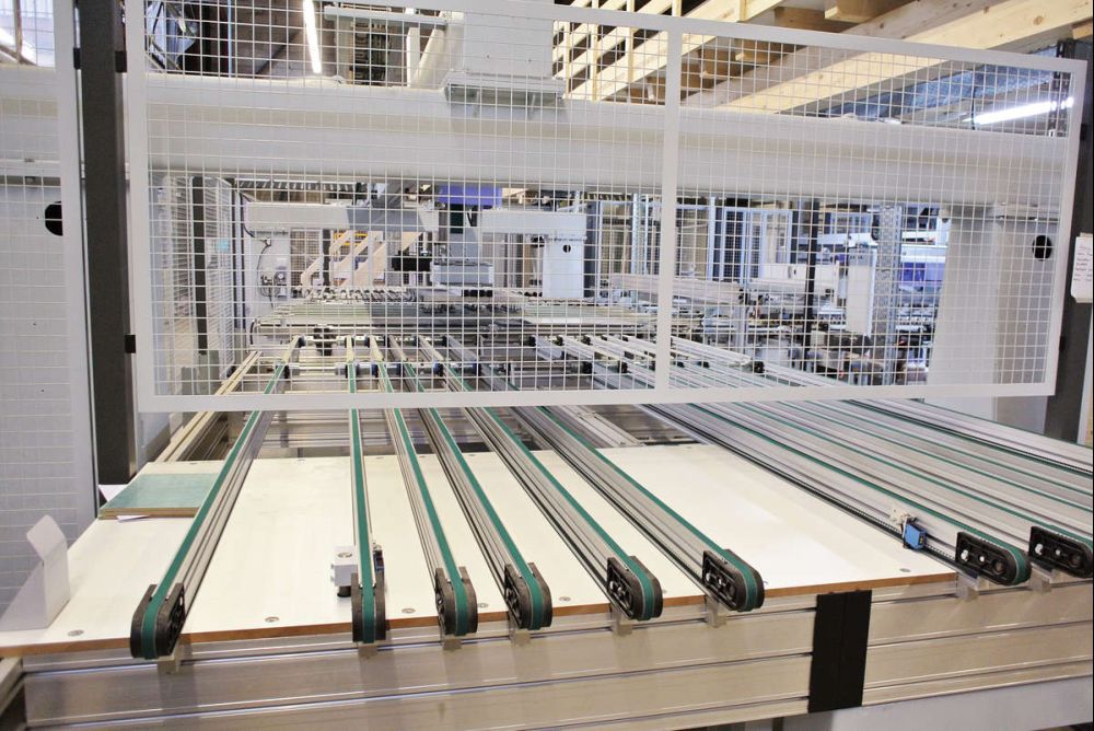 Als Erstes kommt das Plattenmaterial in ein Flächenlager, das nach dem ABC-Prinzip funktioniert. Das bedeutet, die Werkstoffe werden nach ihrer Wichtigkeit für die Produktion eingeteilt. Von den A-Gütern mit einem hohen bis zu den C-Gütern mit einem geringen Einflussgrad werden die Platten auf die jeweiligen Lagerstapel verteilt. Nach dieser Optimierung werden die Platten in der Zuschnittreihenfolge aus dem Lager befördert, voretikettiert und automatisch an den Zuschnitt weitergereicht. Über eine Förderanlage werden die zugeschnittenen Teile in einem Pufferlager zwischengelagert. Dieses Lager steht zwischen dem Zuschnitt und der Kantenanlage. Es hat die Funktion, die anfallenden Massen gestaffelt und nach geforderter Teilesortierung an die Kantenleimmaschine weiterzugeben. Die angeschlossene Kantenanlage kann während des laufenden Betriebs von PU- auf Laser-Kanten umschalten. Loosli ist gemäss eigenen Angaben als erster Schweizer Möbelhersteller in der Lage, Plattenmaterialien ab acht Millimeter Dicke mit Laserkanten zu beschichten, welche dank der neuen Vermessungstechnologie von Kante und Träger ohne nachträgliche Verputzarbeiten auskommen. Zeitgleich ist es möglich, Längsbearbeitungen wie zum Beispiel Nuten oder Falze für Schubladenböden auszuführen.
