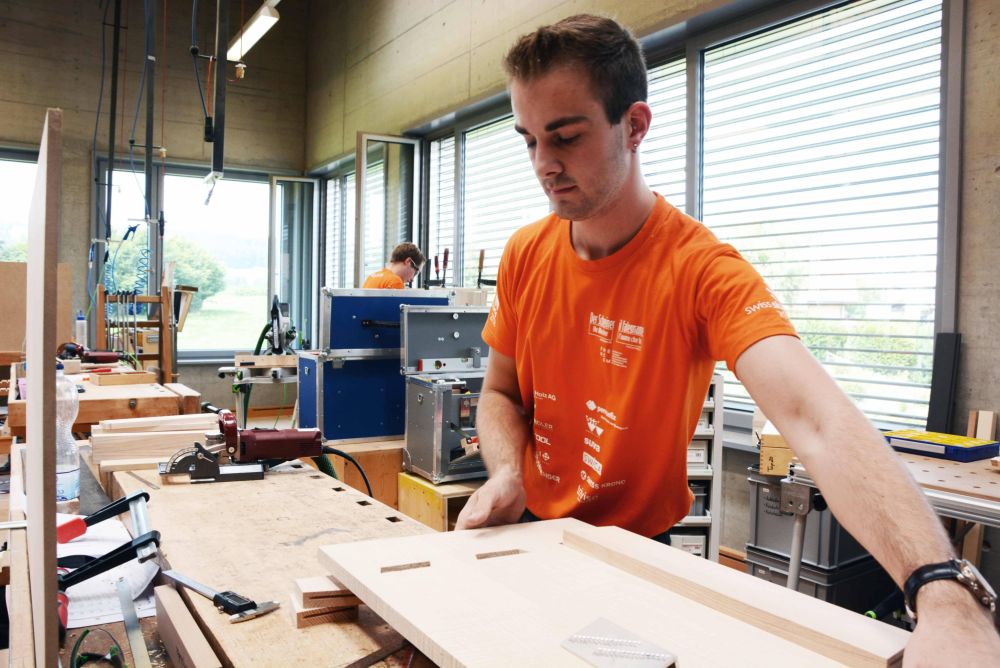 Die Teilnehmer verloren denn auch alle ziemlich viel Zeit in der Anfangsphase. Während sie den Werkplan studierten und versuchten eine Lösung für die Durchdringung der Tischplatte zu finden. Denn die beiden Stehelemente mussten in einem stumpfen Winkel in die Platte versenkt werden. Für die Lösung der Aufgabe gab es kein Patentrezept, nicht alle wählten das gleiche Vorgehen. Experte Roger Huwyler sagte während des Wettkampfs: «Lieber fertig, als perfekt!» Denn jedes unvollendete Teil gibt weniger Punkte, als ein unperfektes. Am Ende schafften es dann nur drei von neun Teilnehmenden, das Möbel ganz fertigzustellen.