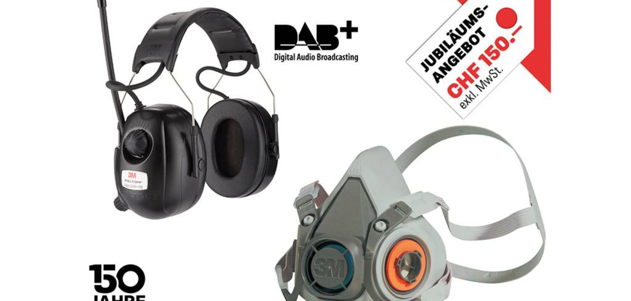 Das April-Jubiläumsangebot der Rudolf Geiser AG ist das «Arbeitsschutz-Set von 3M». Das Set besteht aus einem Gehörschutz 3M Peltor mit eingebautem DAB+ und FM-Radio, sowie dem Atemschutz-Halbmasken-Set 3M 6200.
