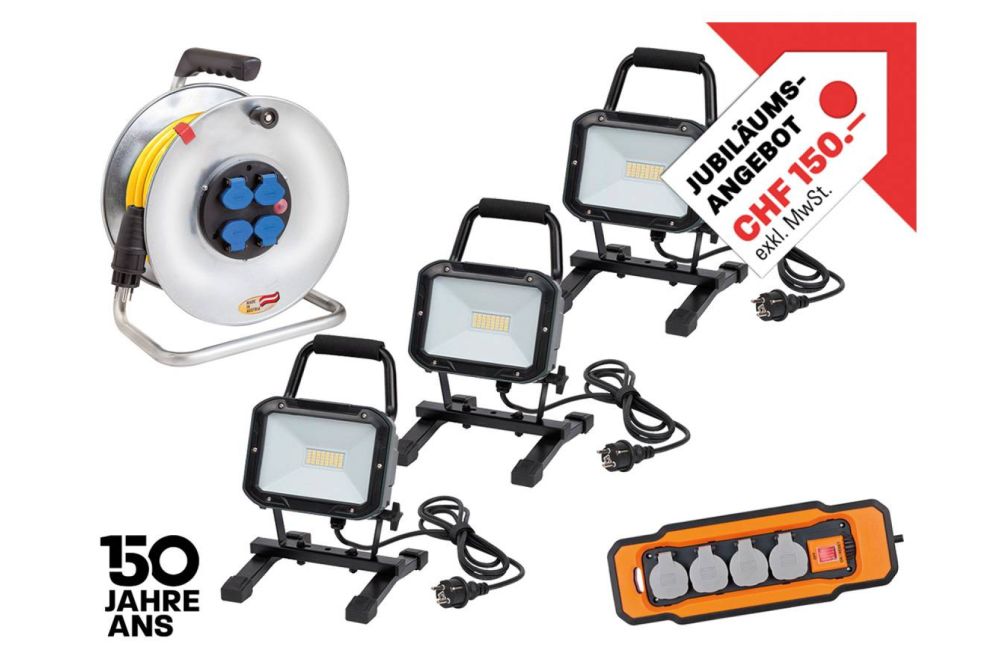 Das Set besteht aus einer Kabelrolle à 33 Meter, einer Steckerleiste mit 4 Steckdosen und drei 3 LED-Baustellenleuchten mit je 30 Watt. Dieses Set, mit einem Marktwert von 335 Franken, gibt es im September 2018 für nur 150 Franken (Preis exklusiv MwSt. und nur gültig solange Vorrat).